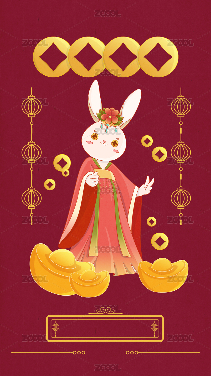 穿着汉服的兔子骑在舞狮头上拿着兔年大吉