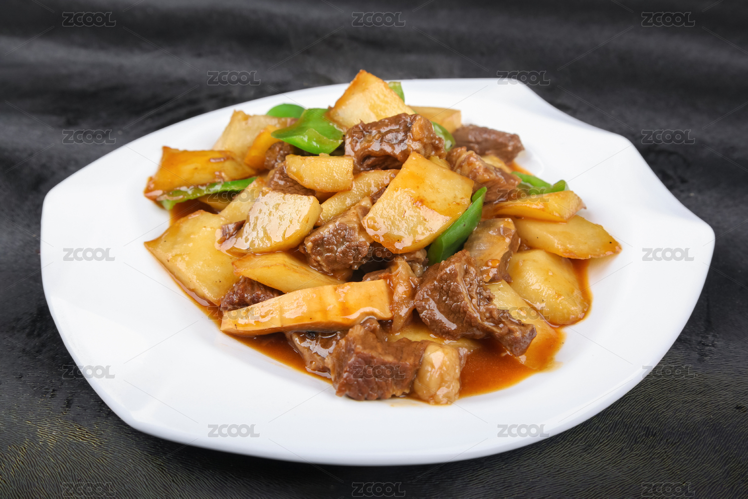 圆形白瓷盘装的山药鱼二豆角炖鸡块