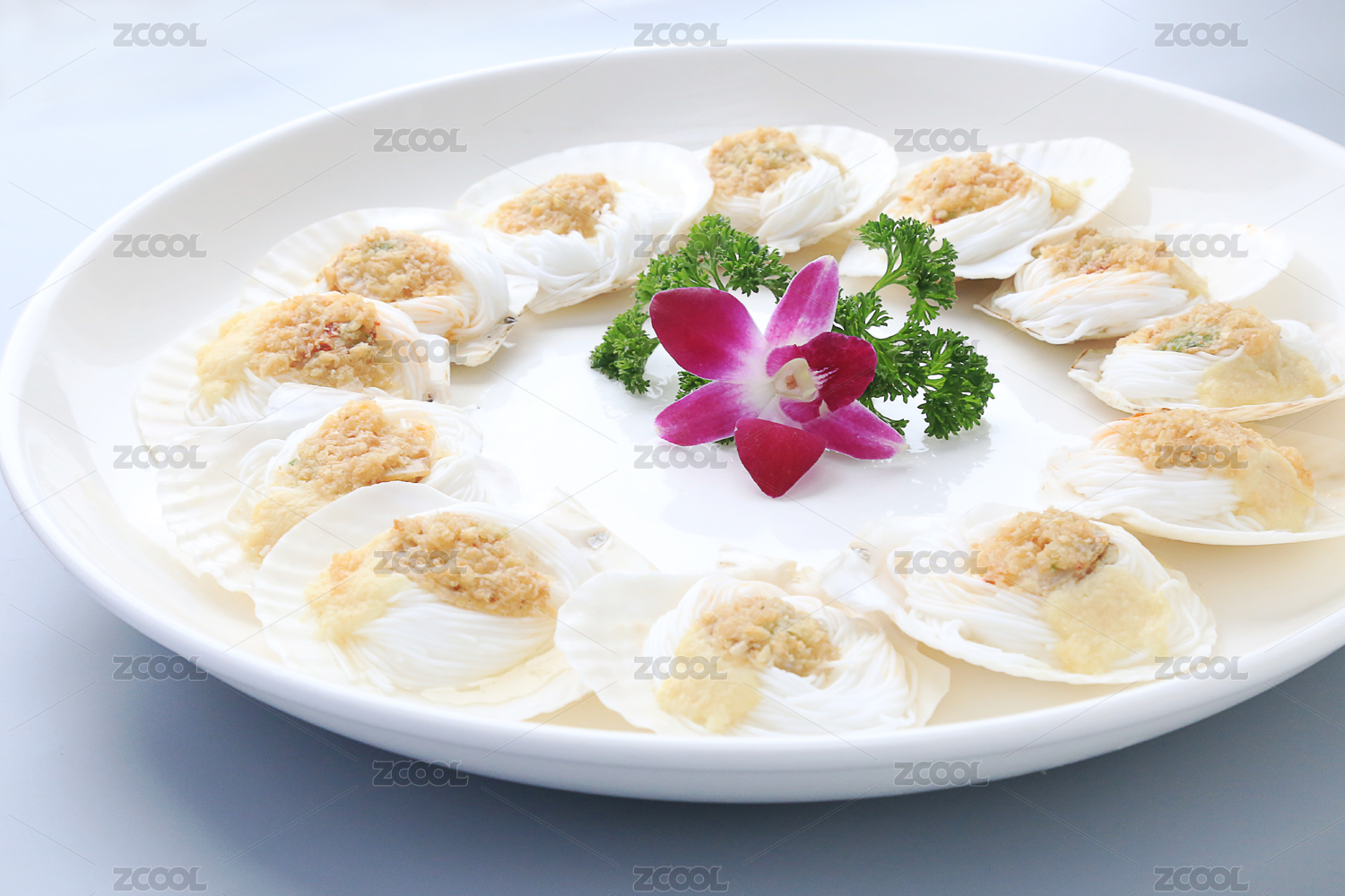 餐桌上的一碟蒜蓉粉丝蒸扇贝