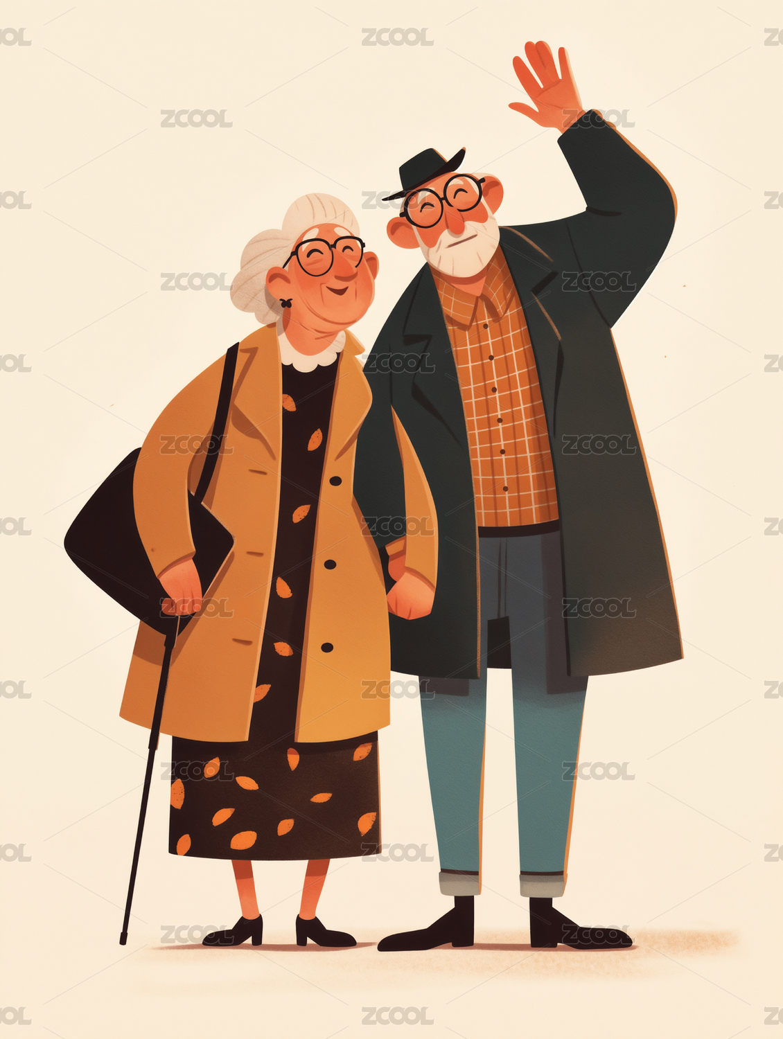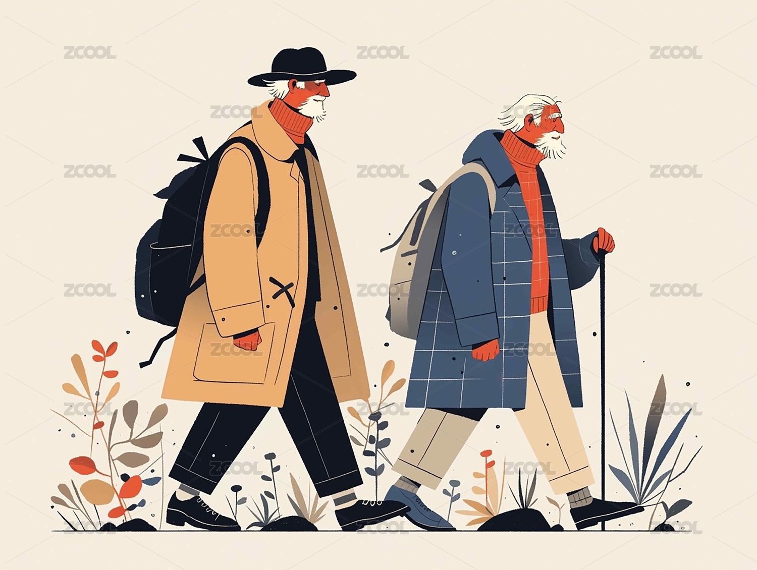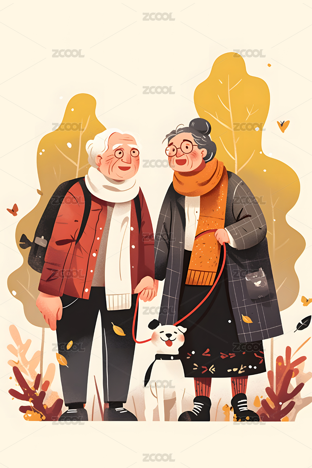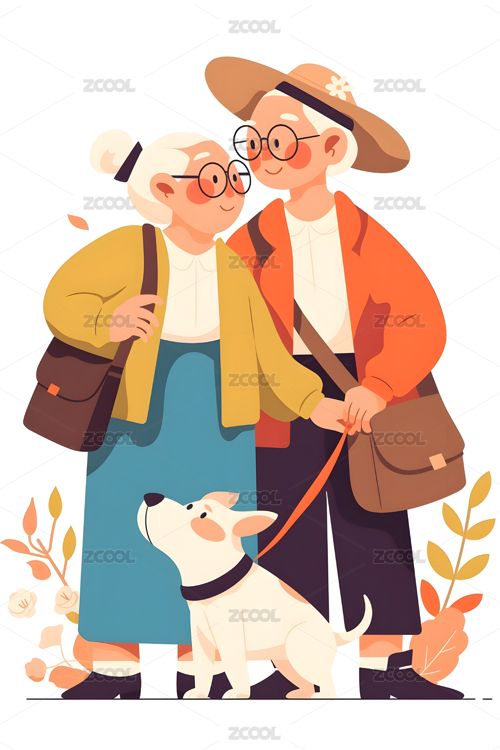 扁平矢量风格一男一女牵狗徒步剪影插画