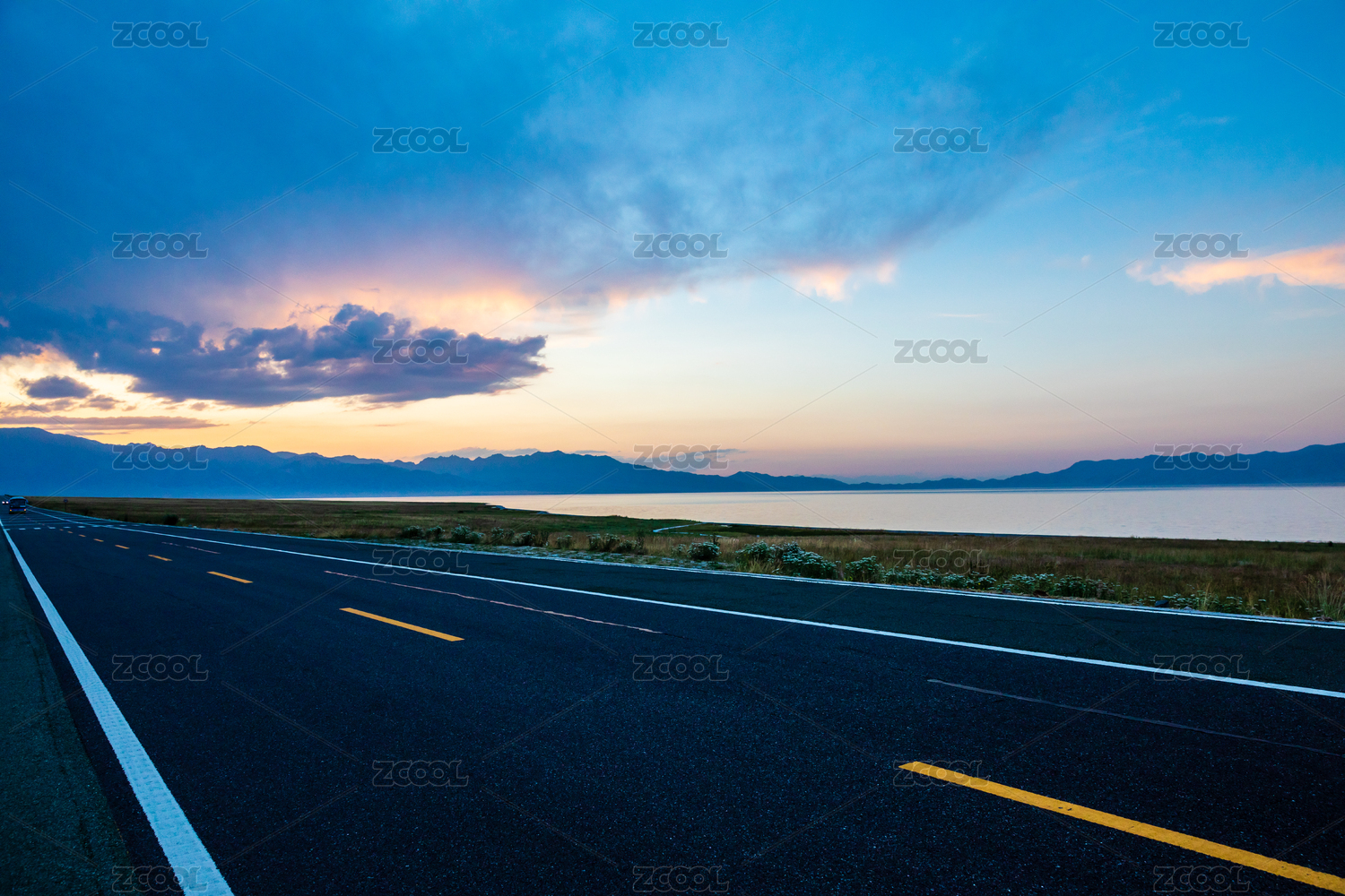 中国新疆赛里木湖蓝天白云下的公路