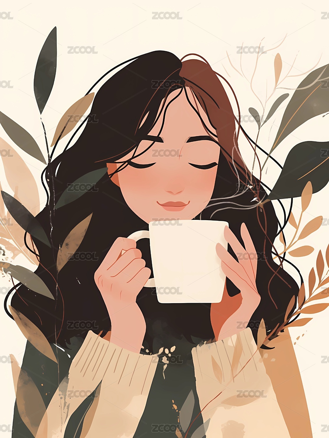 飘逸长发的美女与植物清新唯美插画