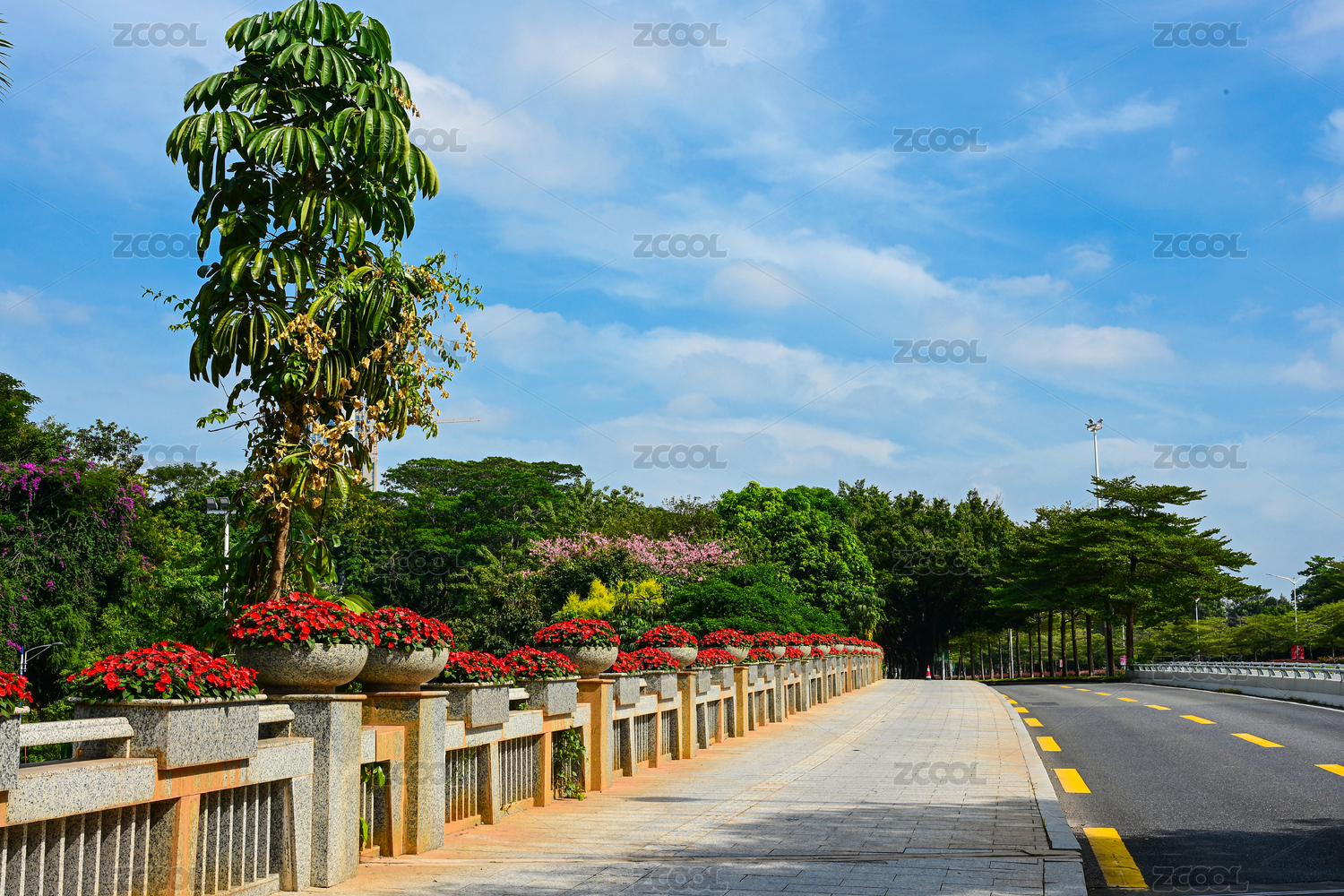 蓝天白云下深圳城市道路旁的绿植花卉景观