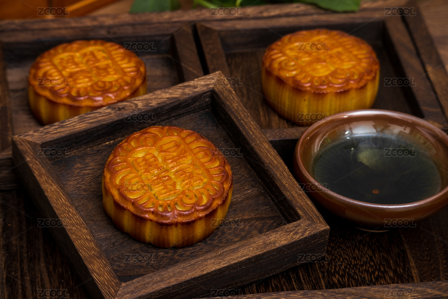 黑色幕布上摆放着月饼和茶