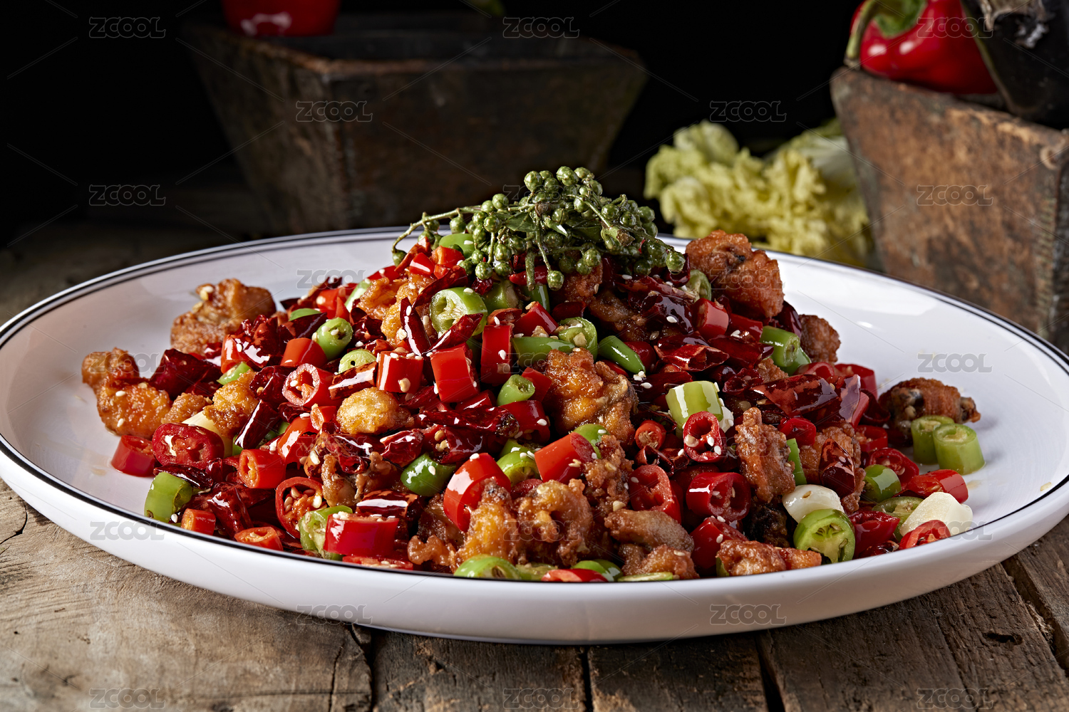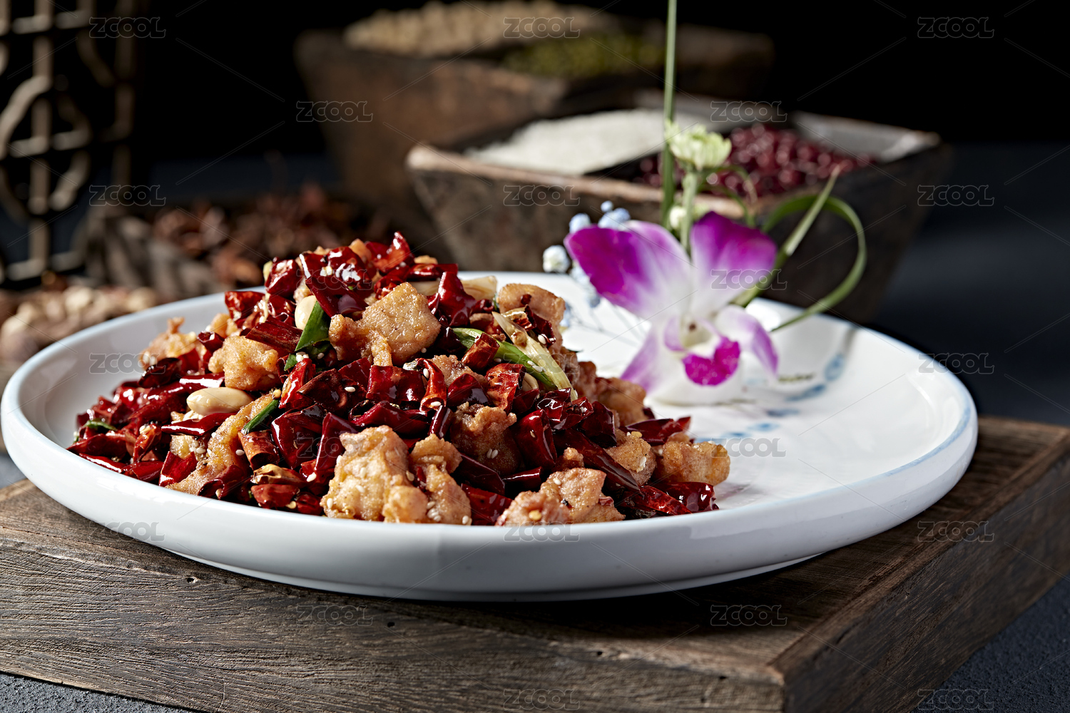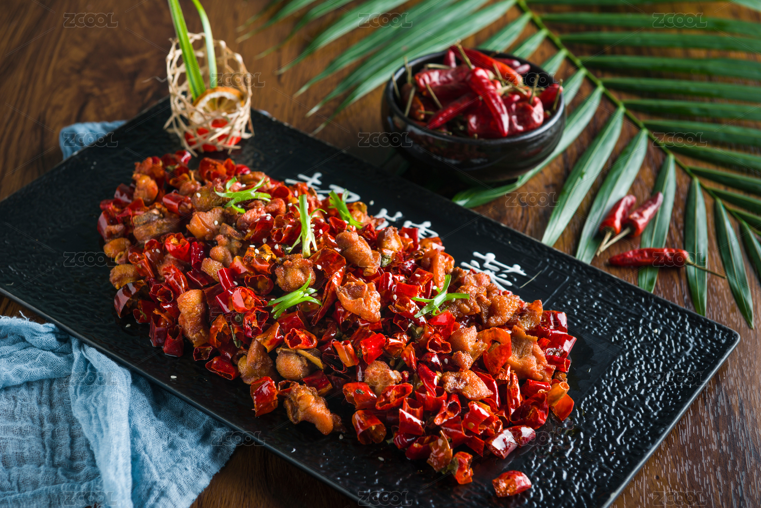一碟中式菜肴辣子炒鸡