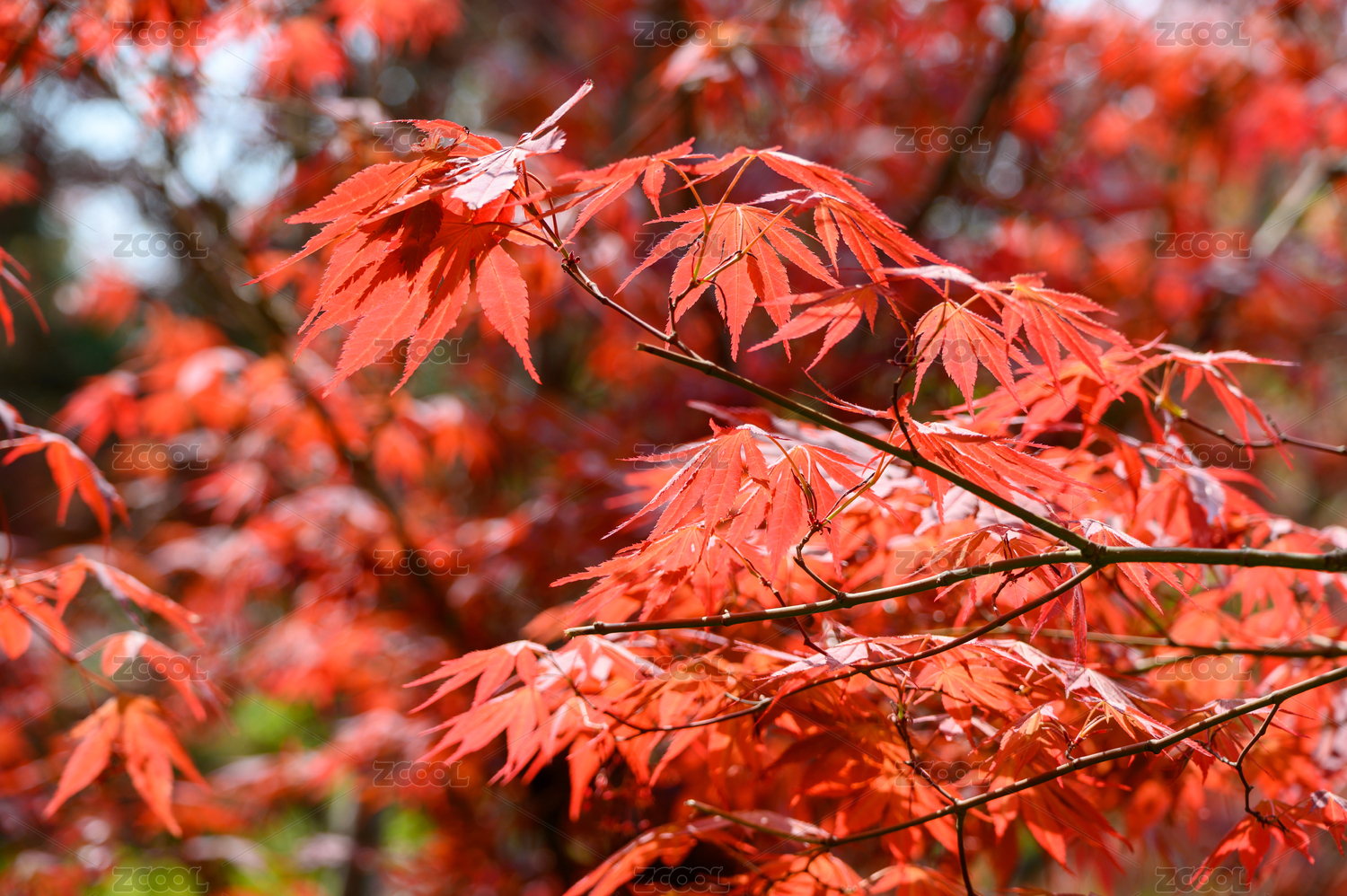阳光红枫叶蓝天背景