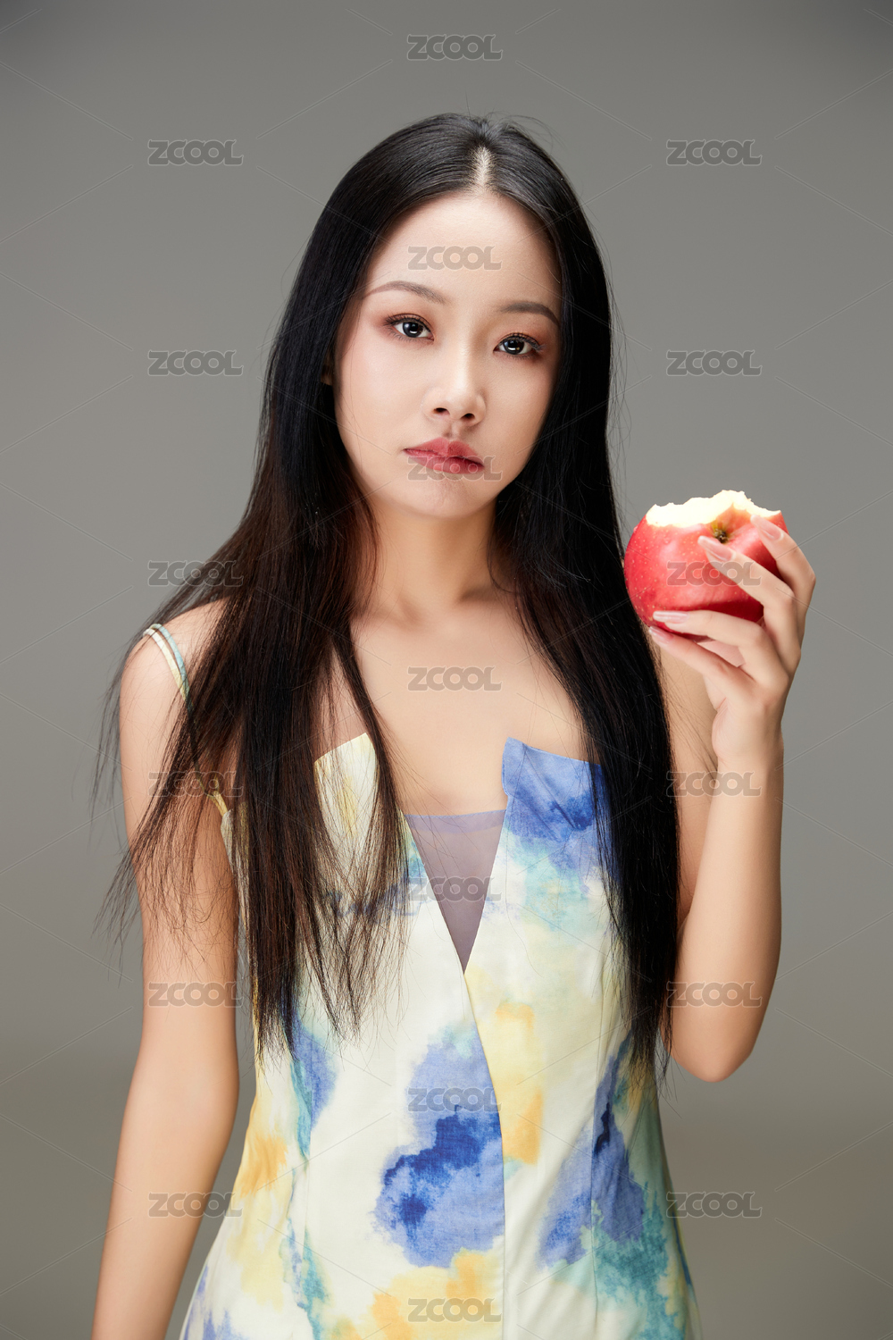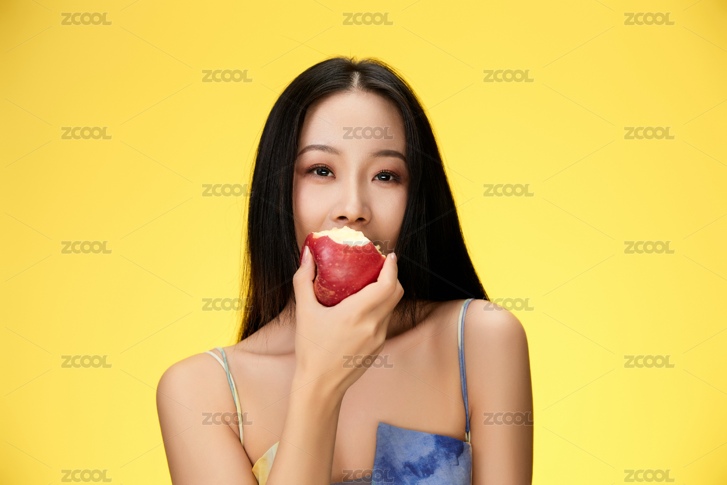 吃水果的中国长发少女
