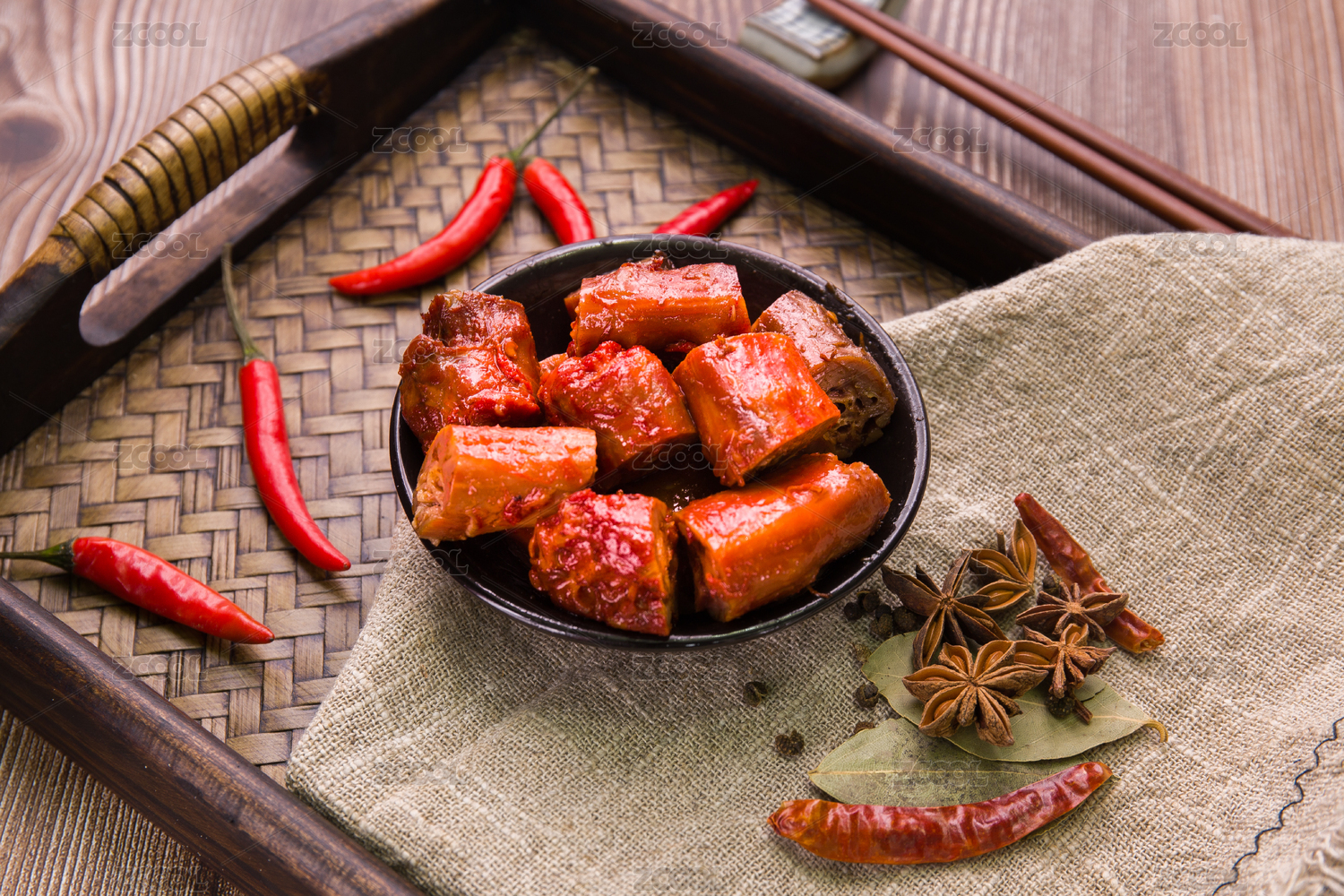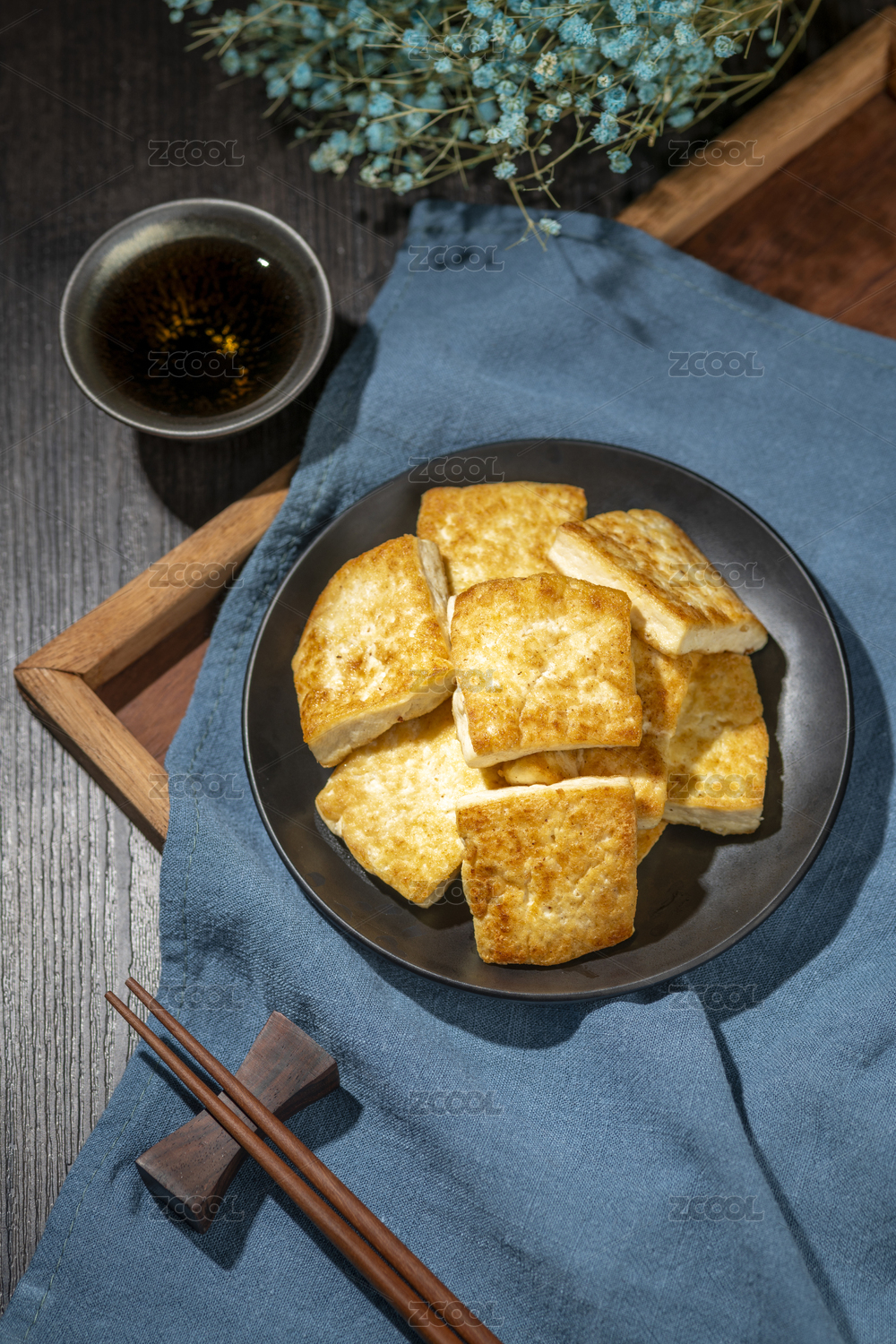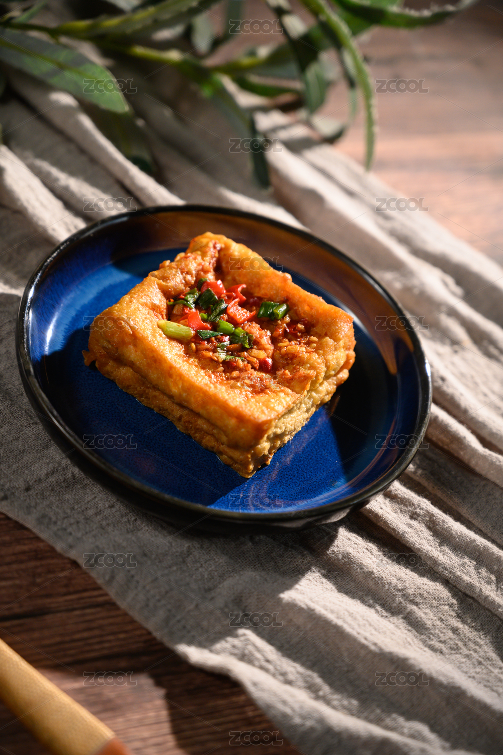 一盘油炸豆腐摆放在木桌面上特写深色调