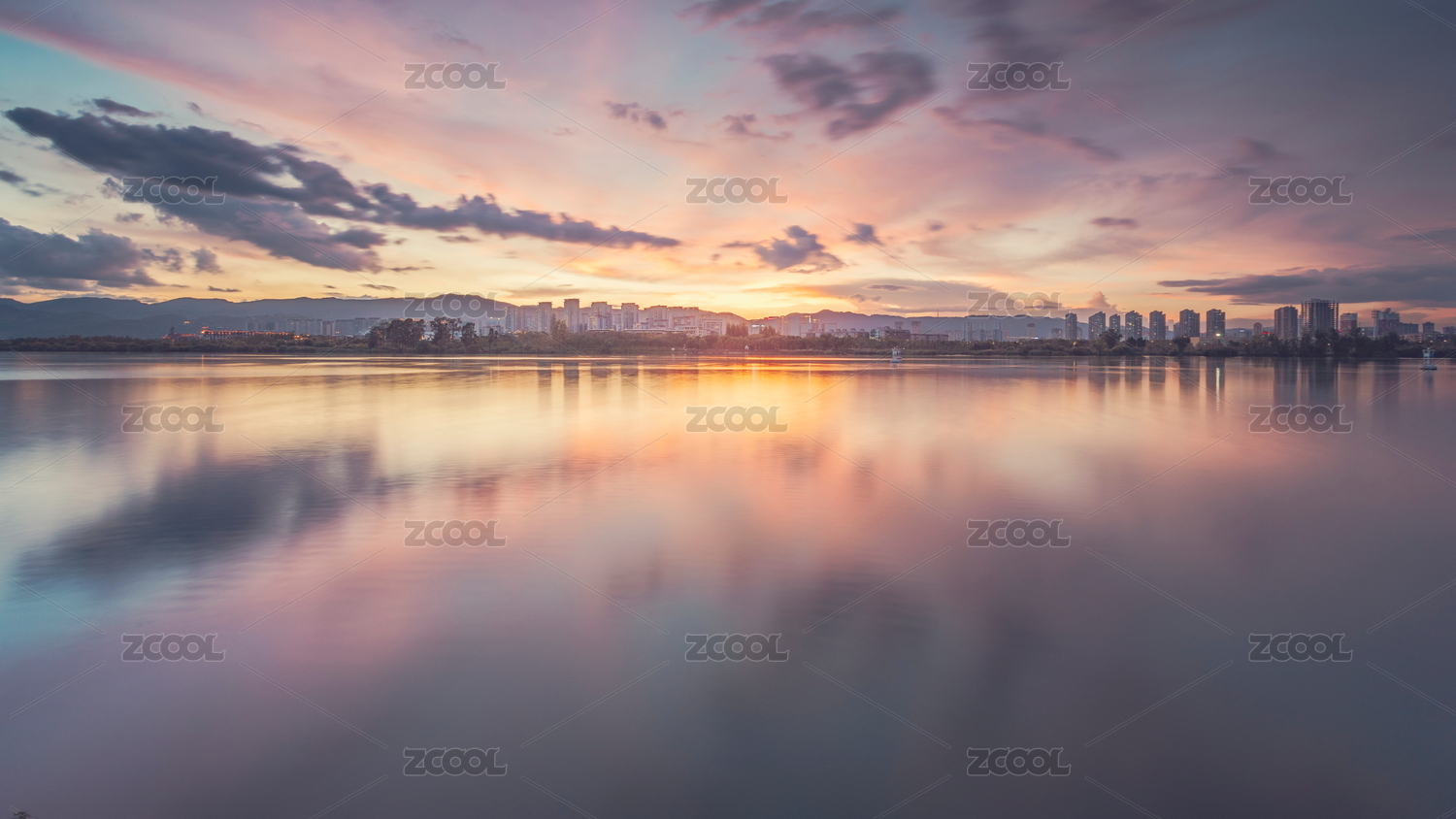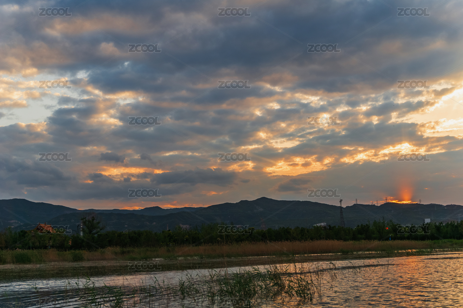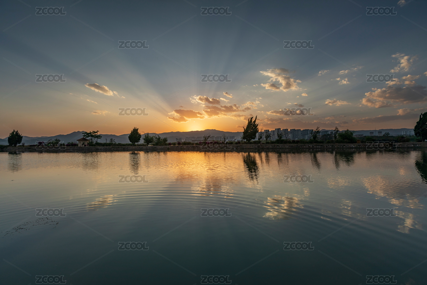 四川西昌邛海日出时分丁达尔光线映射湖面