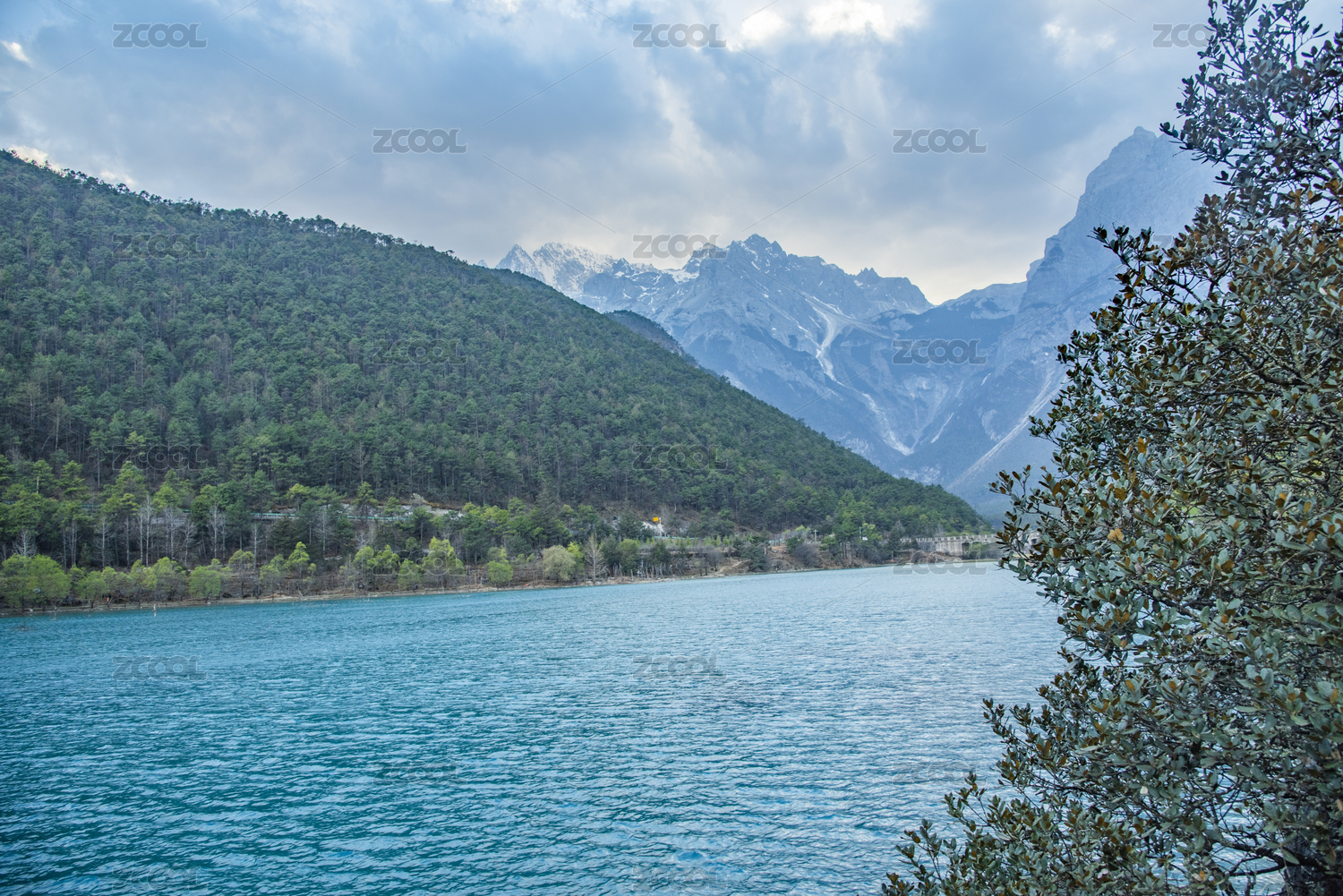 中国云南省丽江市,雪山前山林环绕的碧绿湖泊