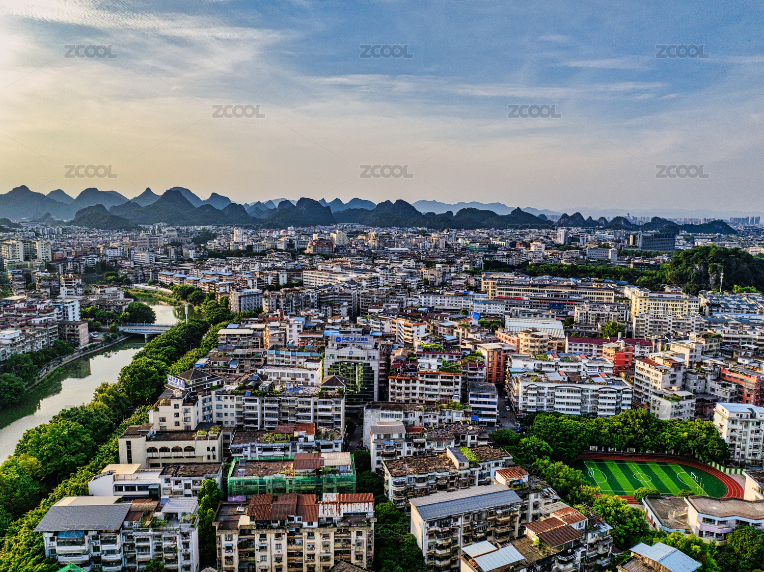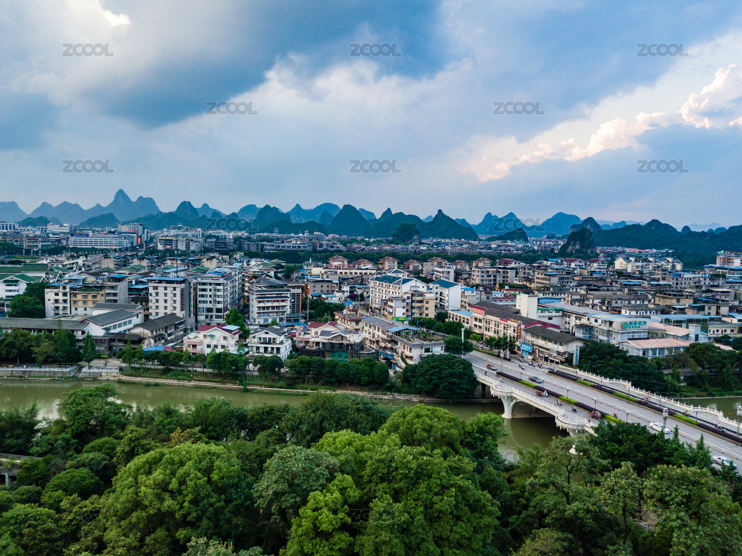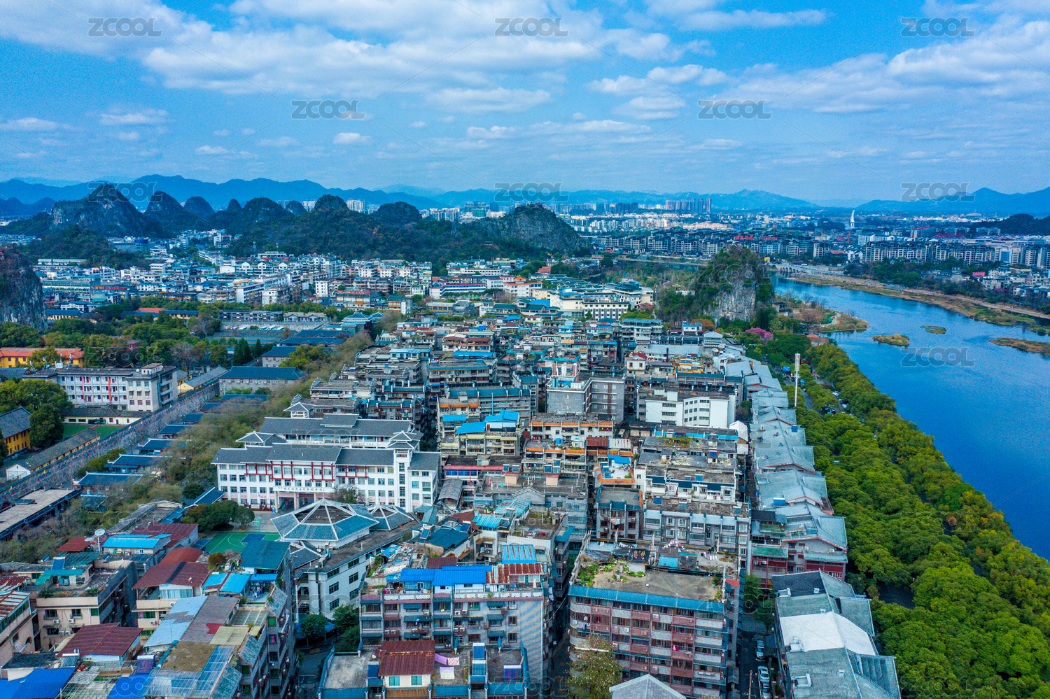 广西桂林漓江城市建筑喀斯特峰林航拍风光