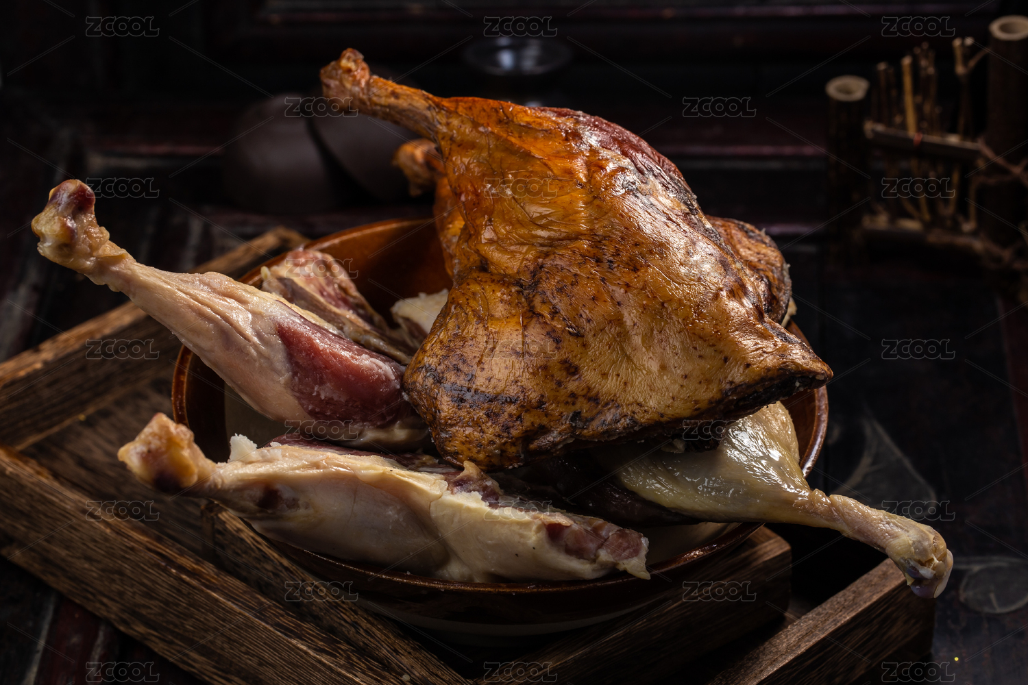 碗里熏制的鸭腿和半风干的鸭腿