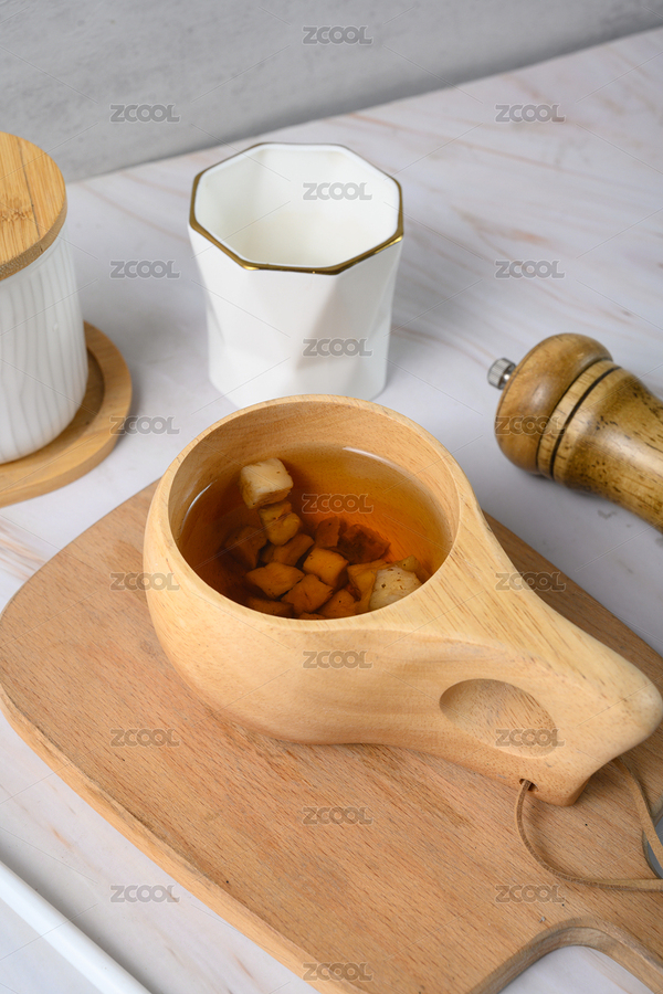 桌面上的杯子里的甘甜可口的胰岛果茶