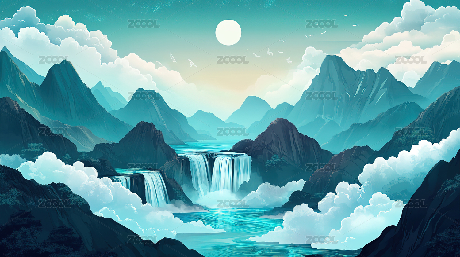 瀑布云雾山水间插画