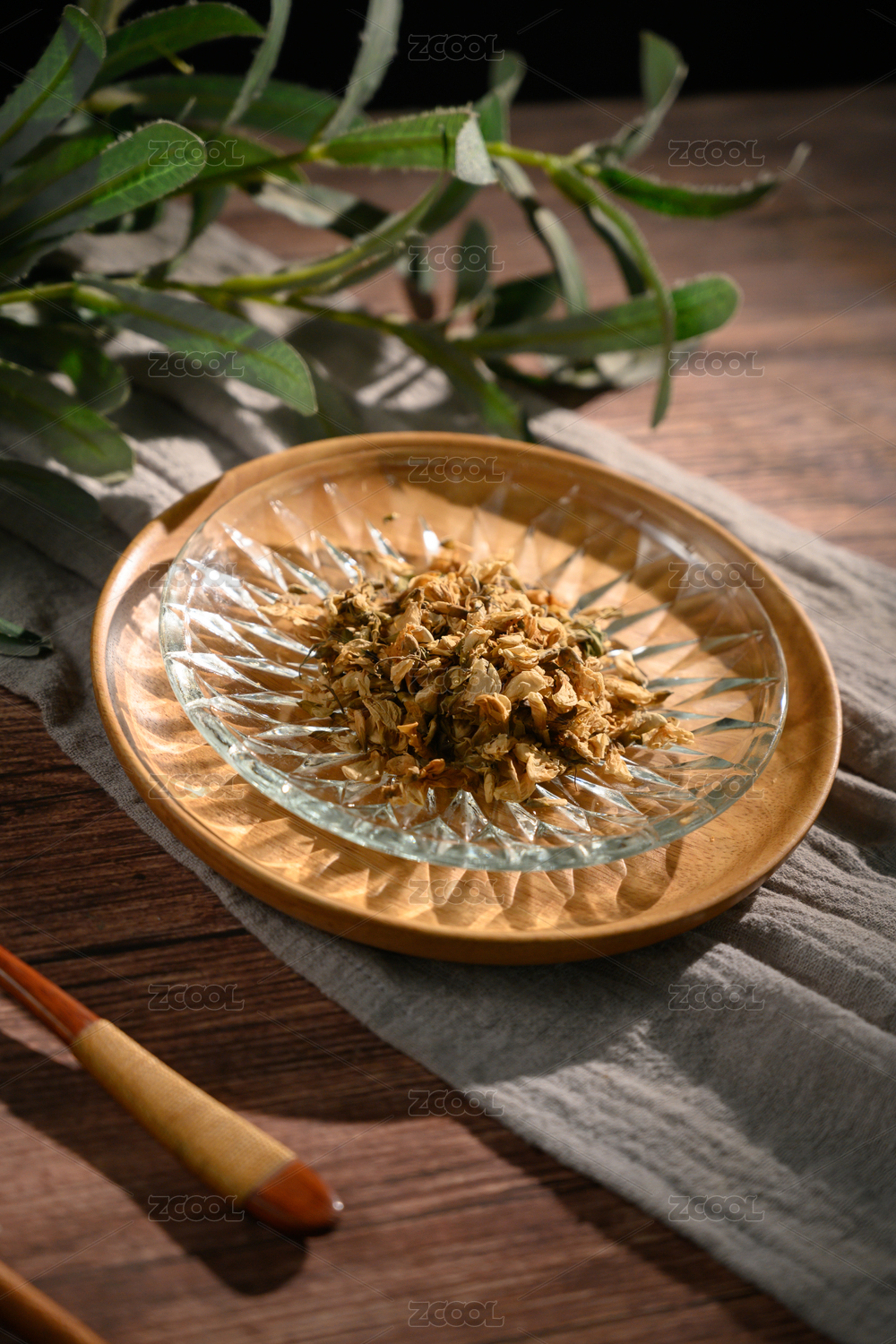 桌面上的盘子里的干爽的花草茶