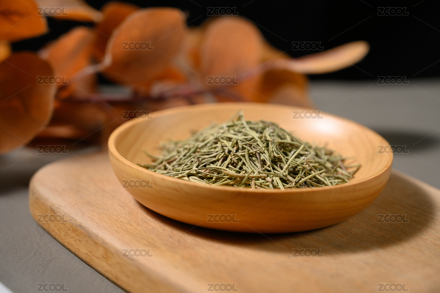 桌面上的盘子里的干爽的干迷迭香