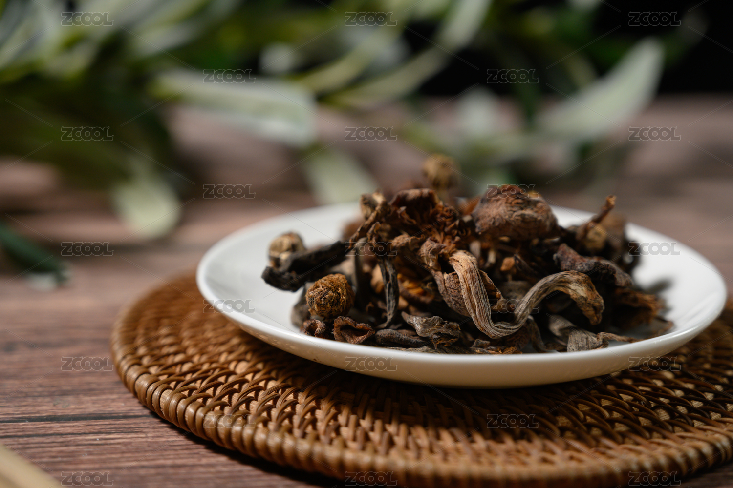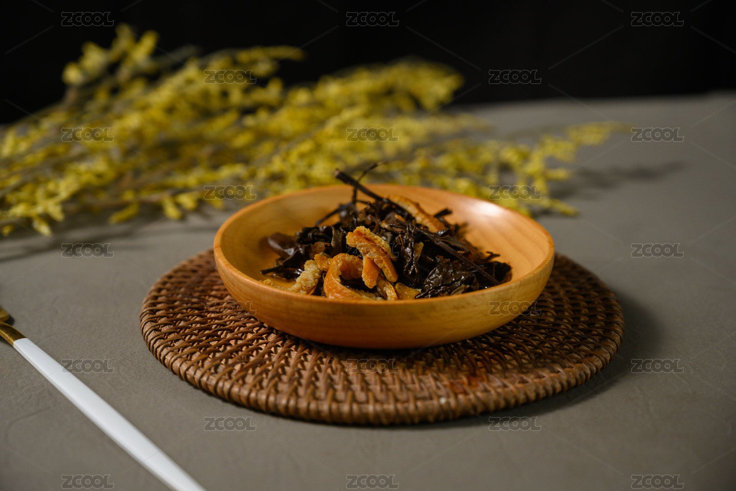桌面上的盘子里的美味可口的陈皮白茶叶