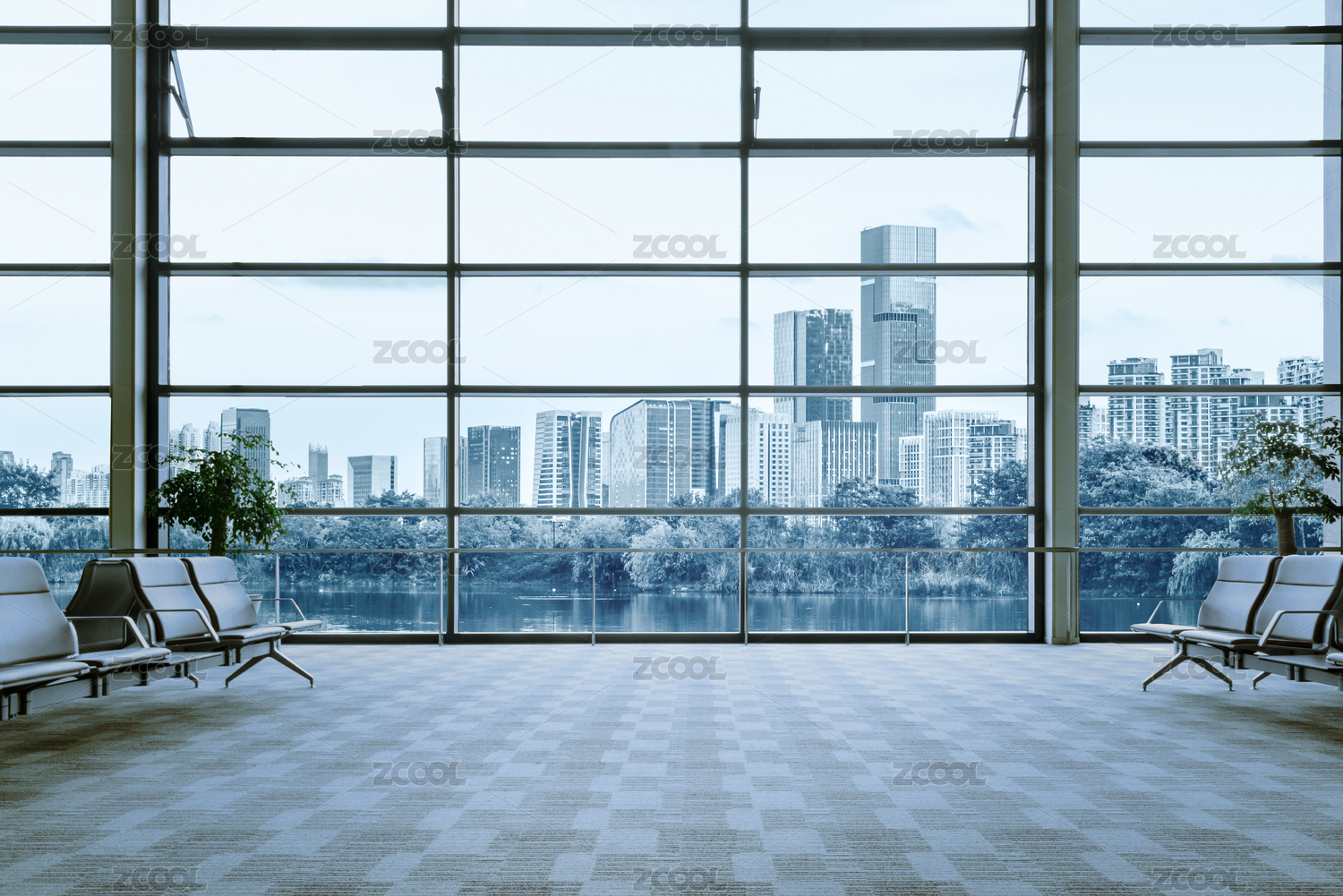 空旷的室内空间与窗外的上海陆家嘴早晨