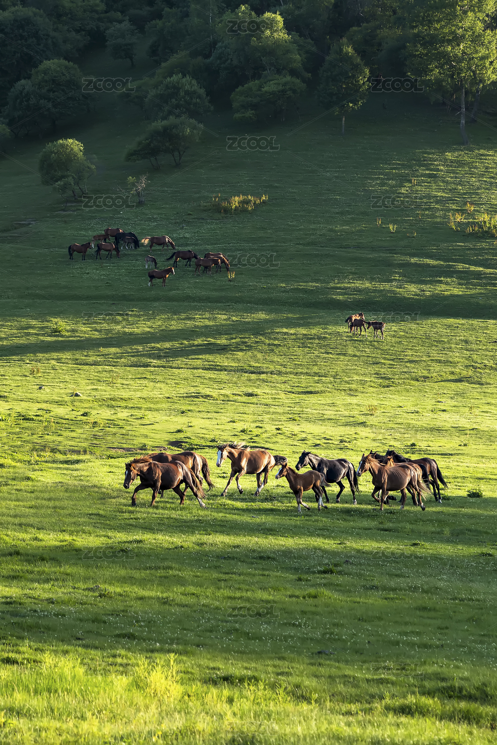清晨在内蒙古乌兰布统草原牧民赶着马群去放牧