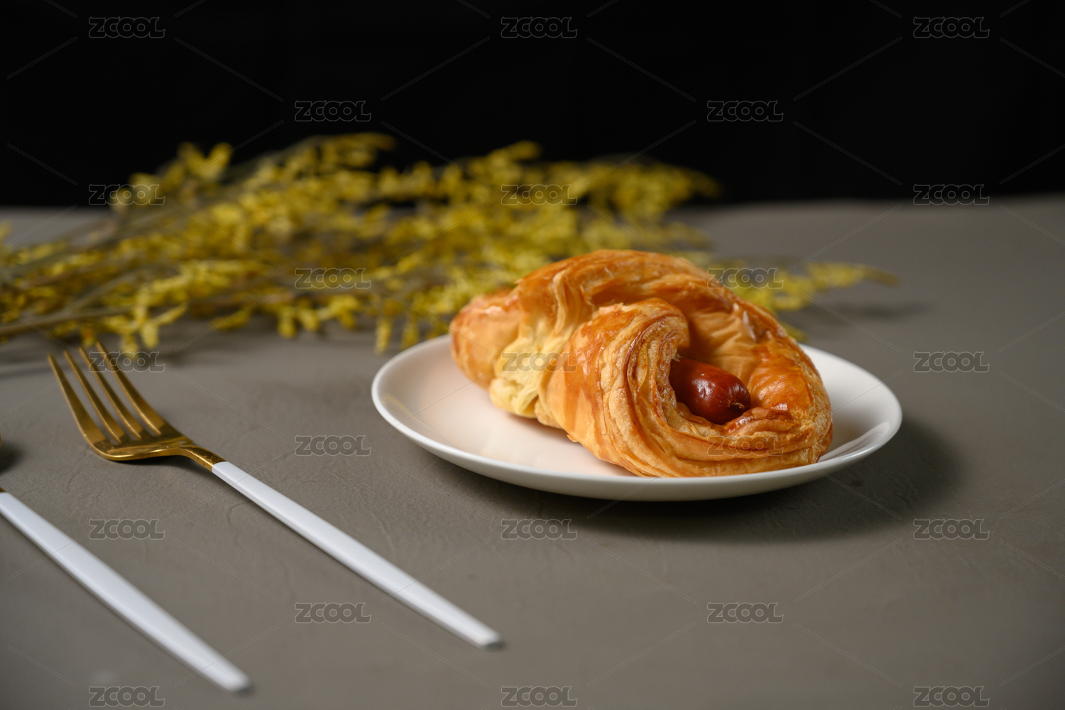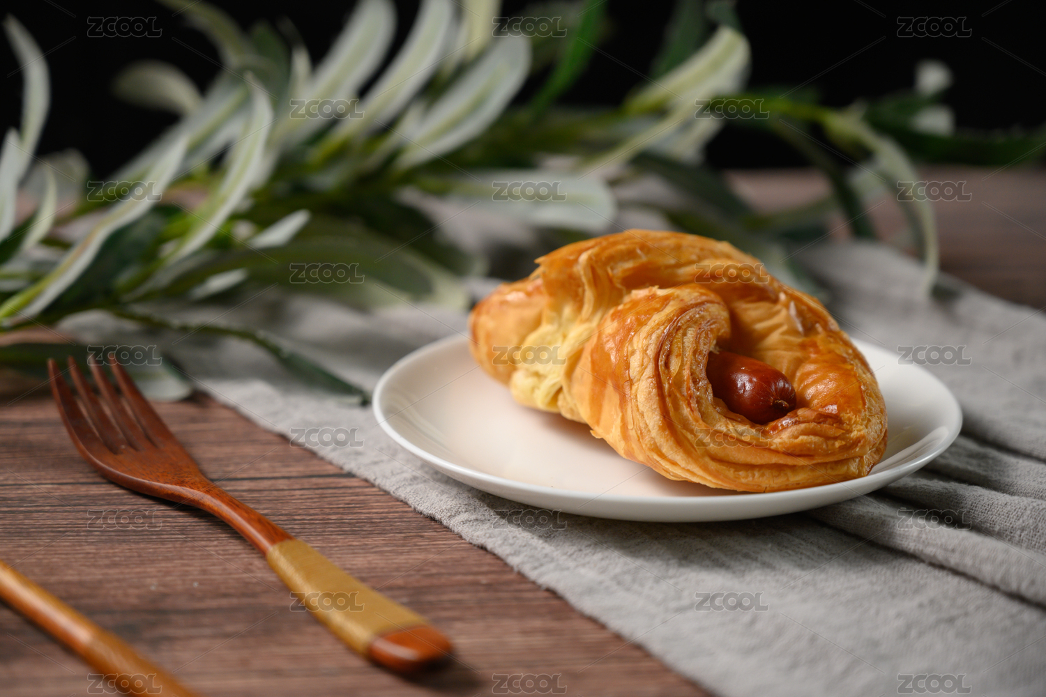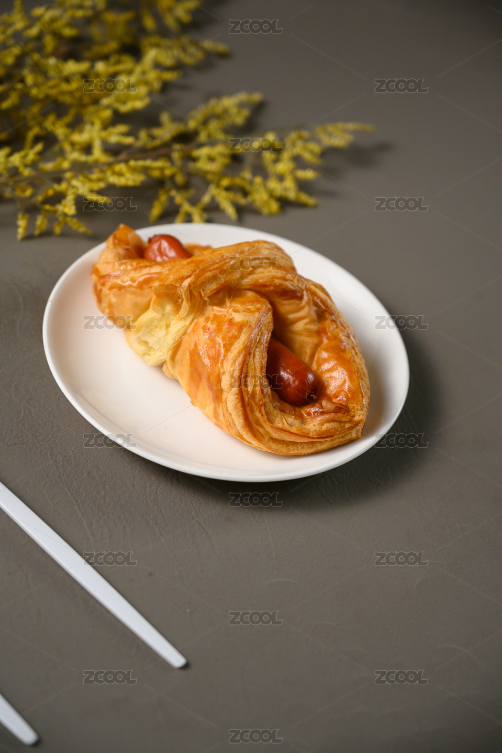 桌面上的盘子里的美味可口的丹麦肠仔包
