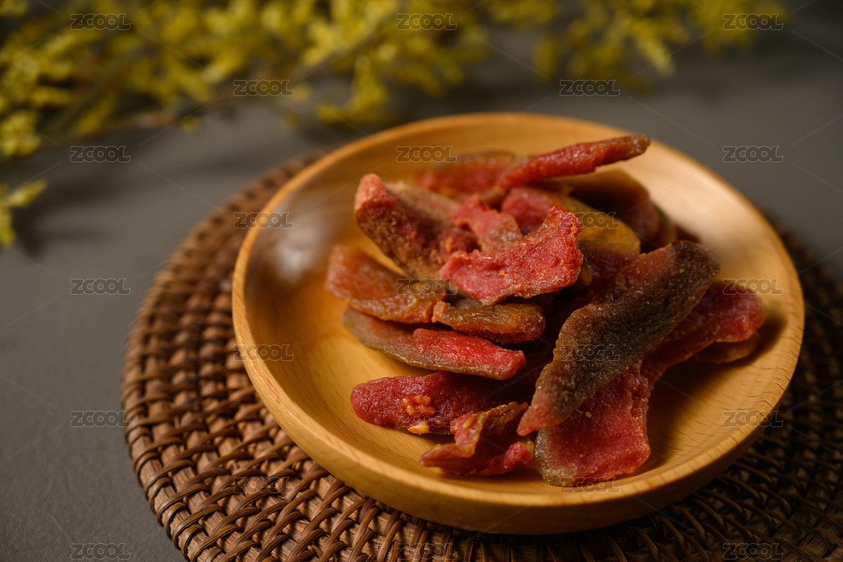 桌面上的盘子里的美味可口的芭乐干