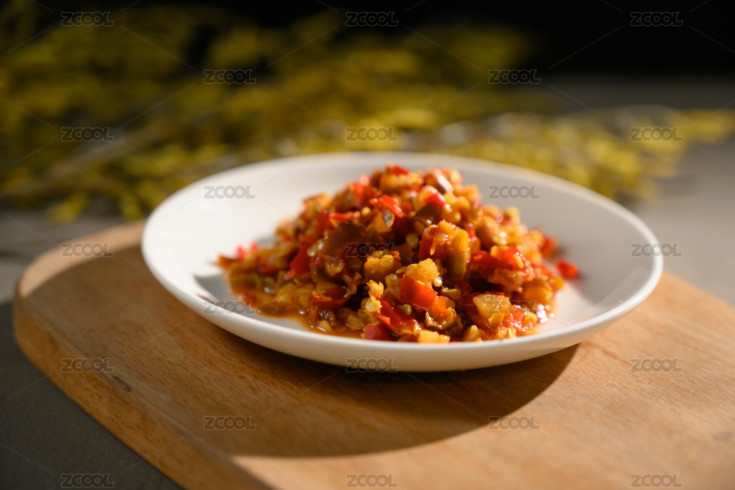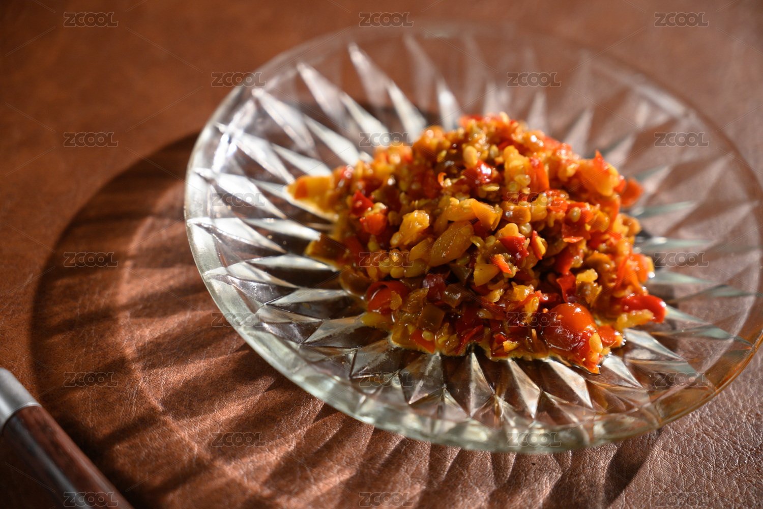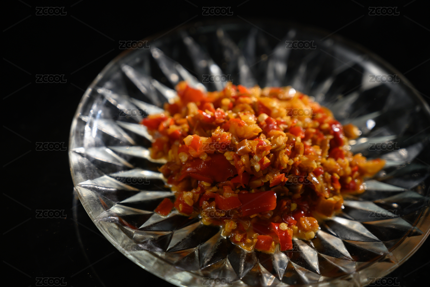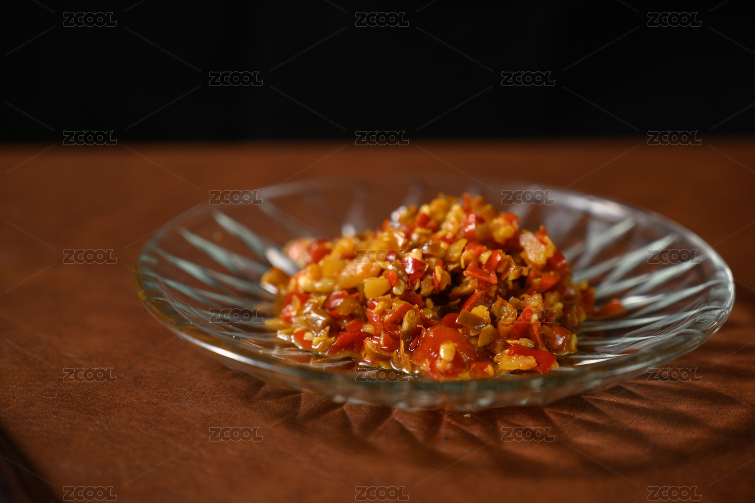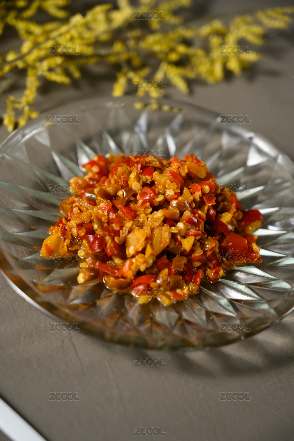 桌面上的盘子里的美味可口的青红剁椒