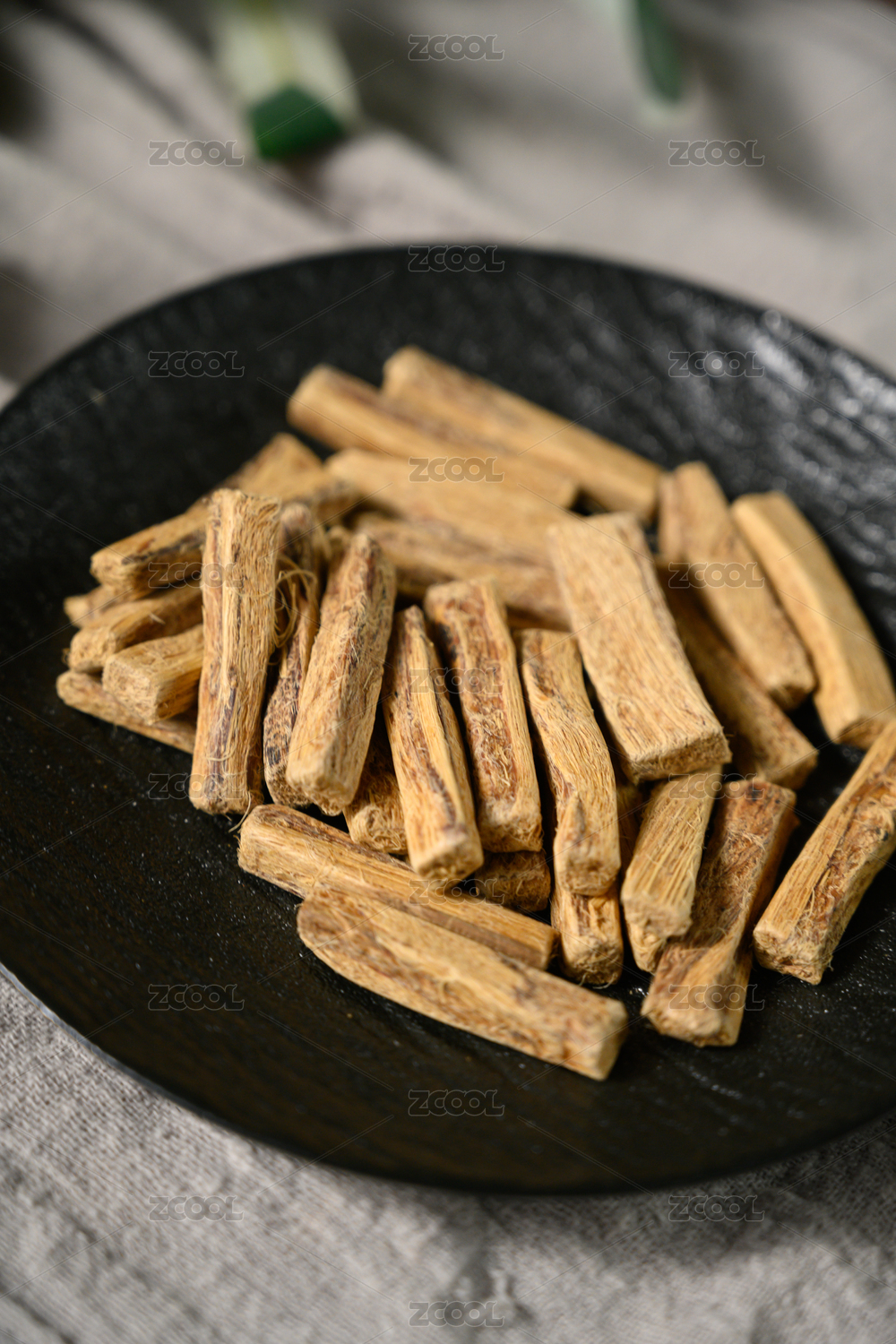 桌面上的盘子里的美味可口的口嚼葛根
