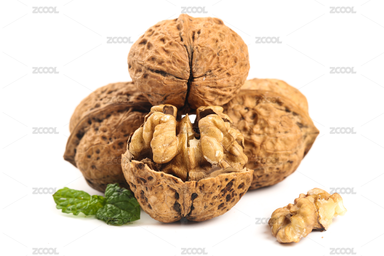 新鲜的核桃、核桃仁,剥开的核桃白色背景
