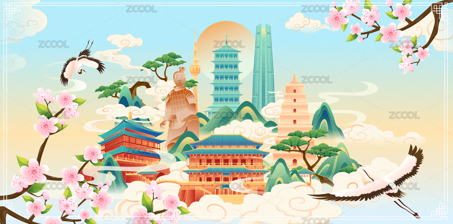 建筑,旅游,城市,风景,桃花,仙鹤,祥云,城市天际线,地标,旅行