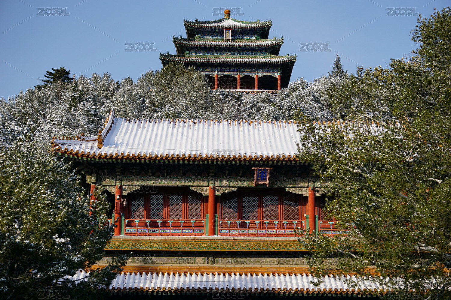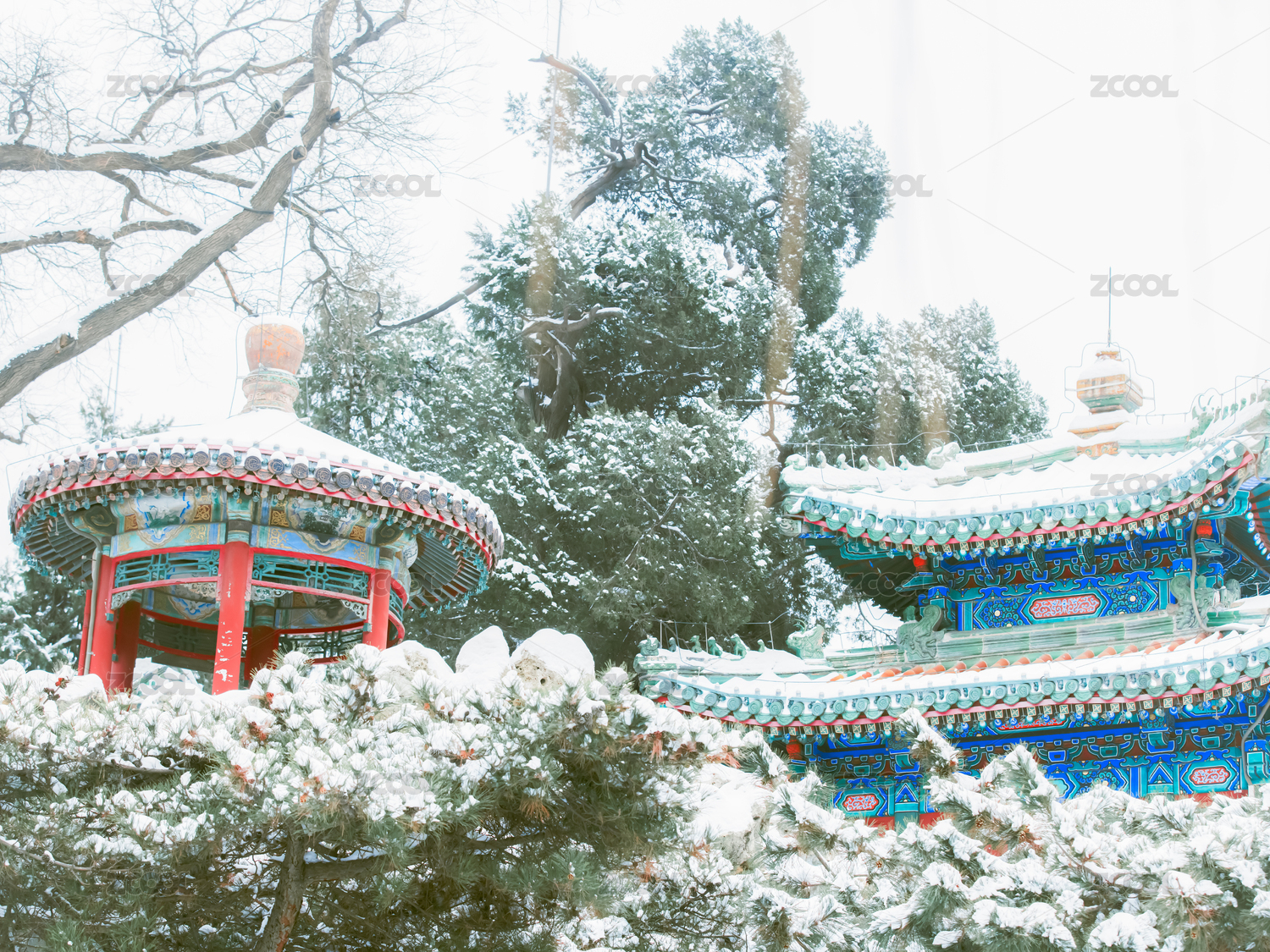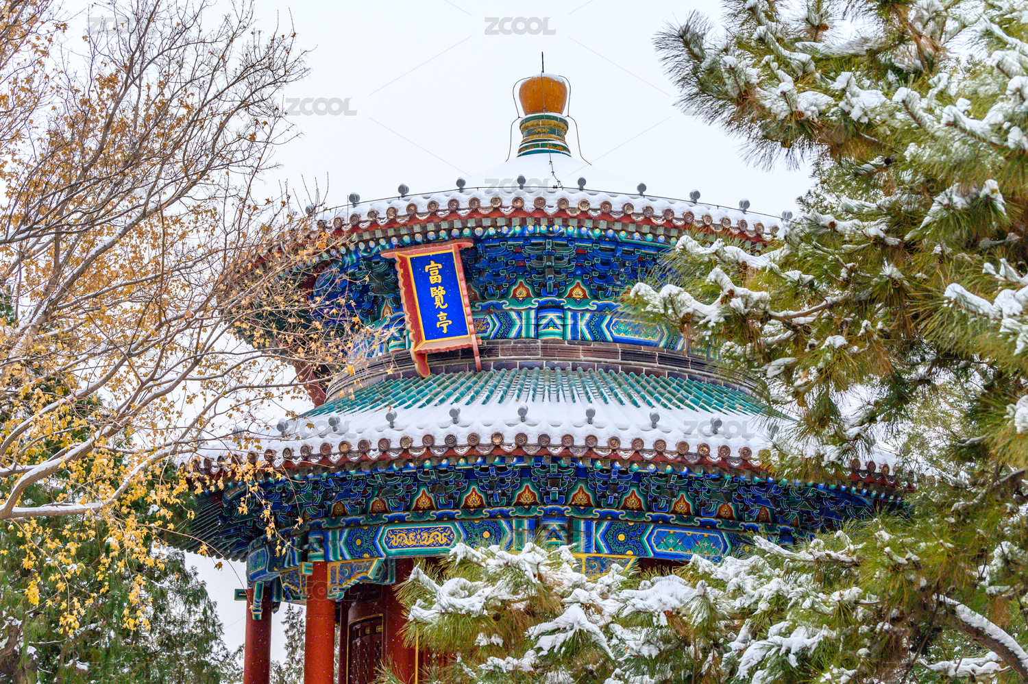 中国北京冬季景山公园辑芳亭雪后建筑风光