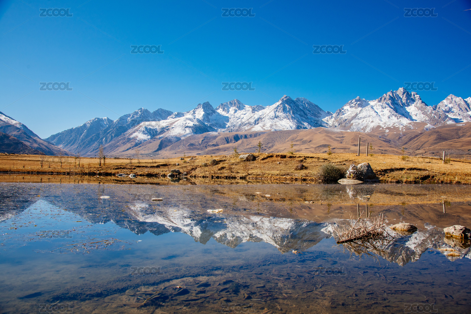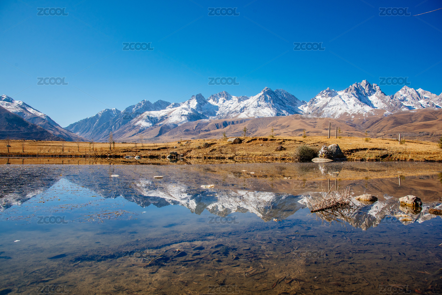 蓝色天空下,远方的雪山倒映在湖泊之中
