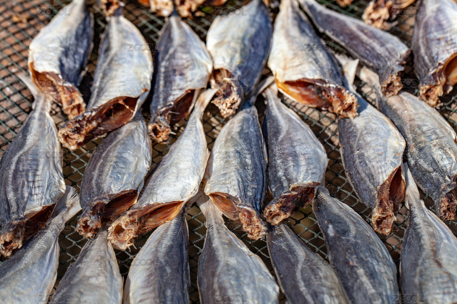海边渔民晾晒的海鲜鱼类马鲛鱼干特写