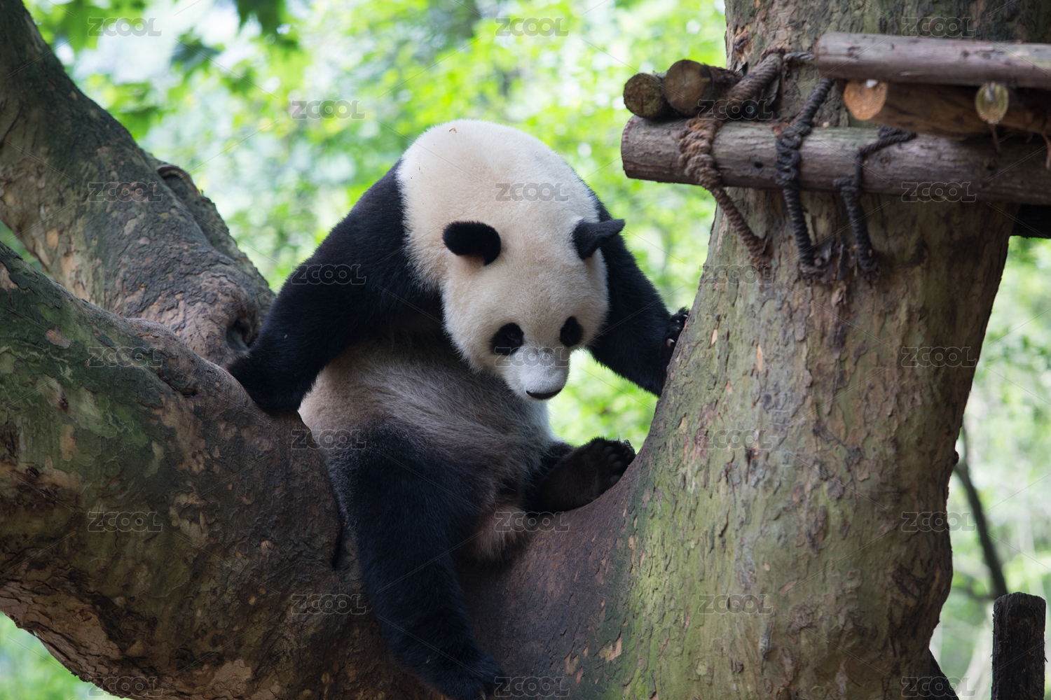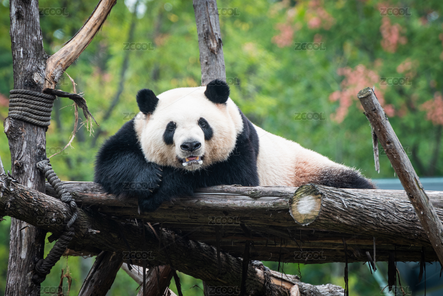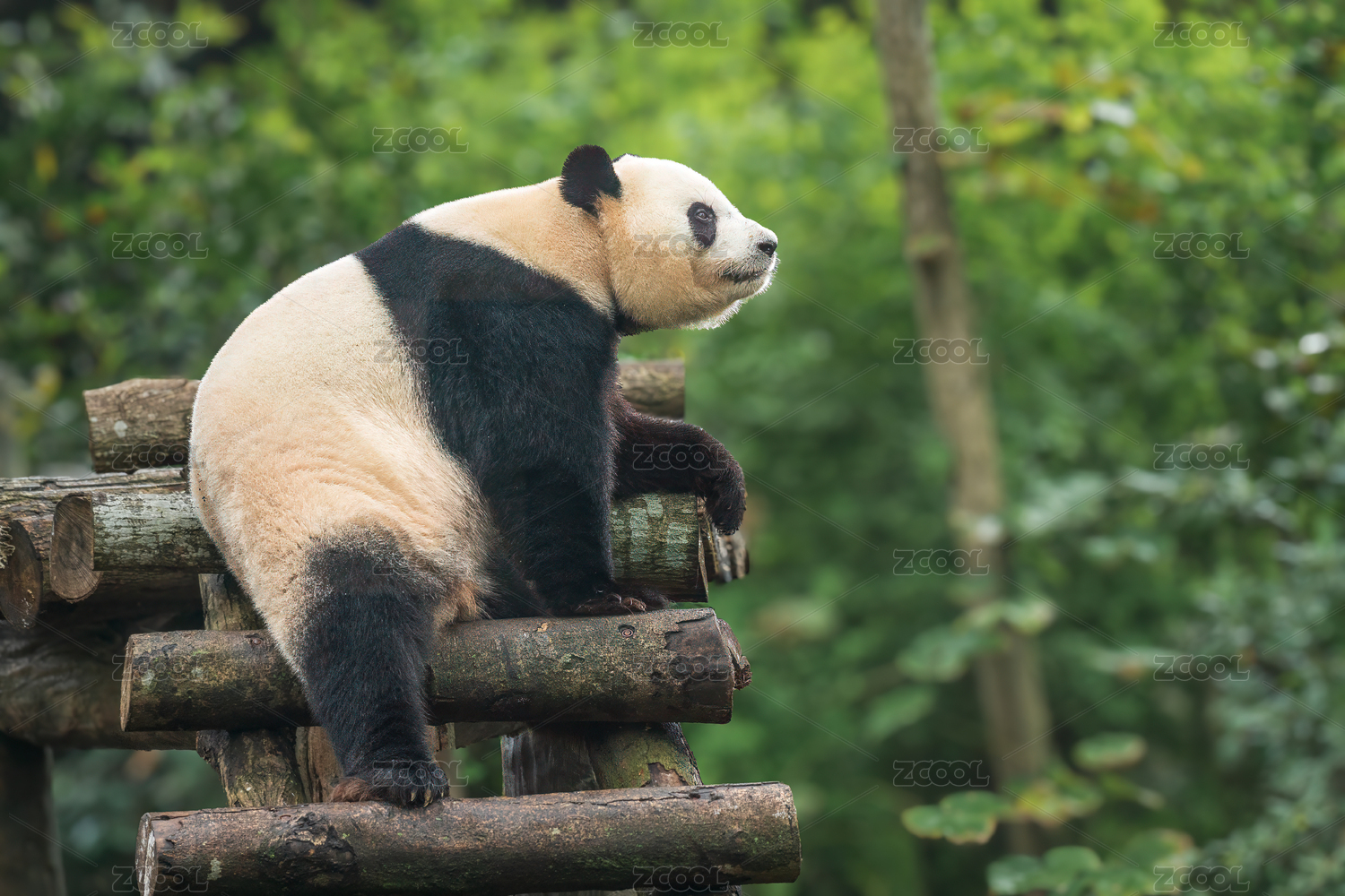 中国四川熊猫谷夏季坐躺在原木上的大熊猫