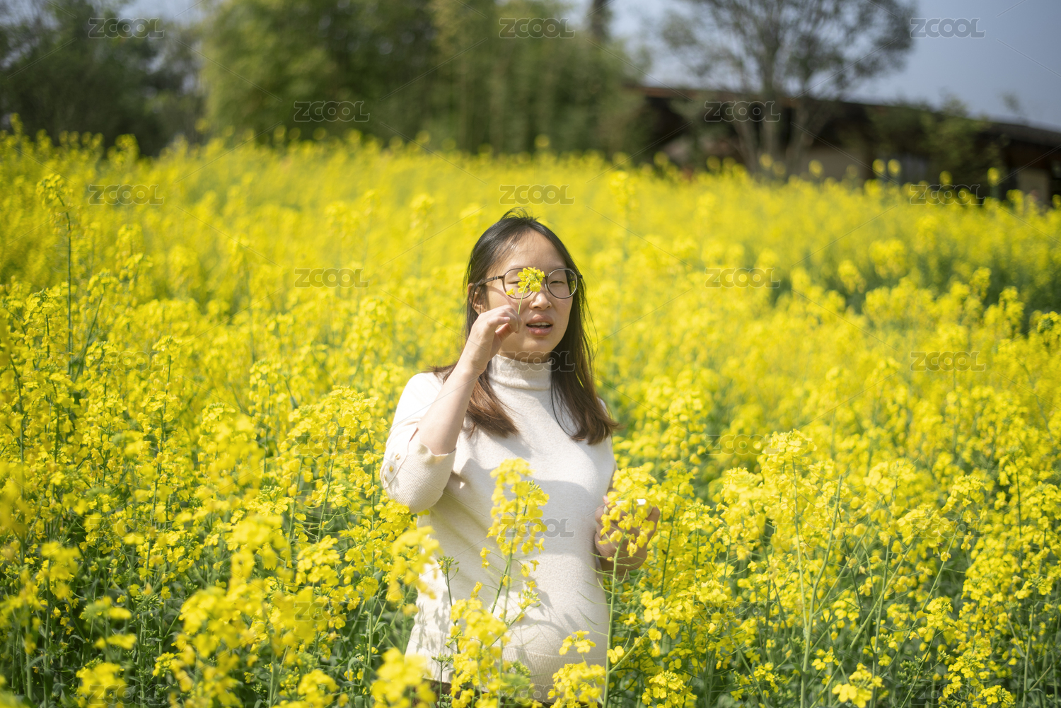 女生在油菜花地里游玩