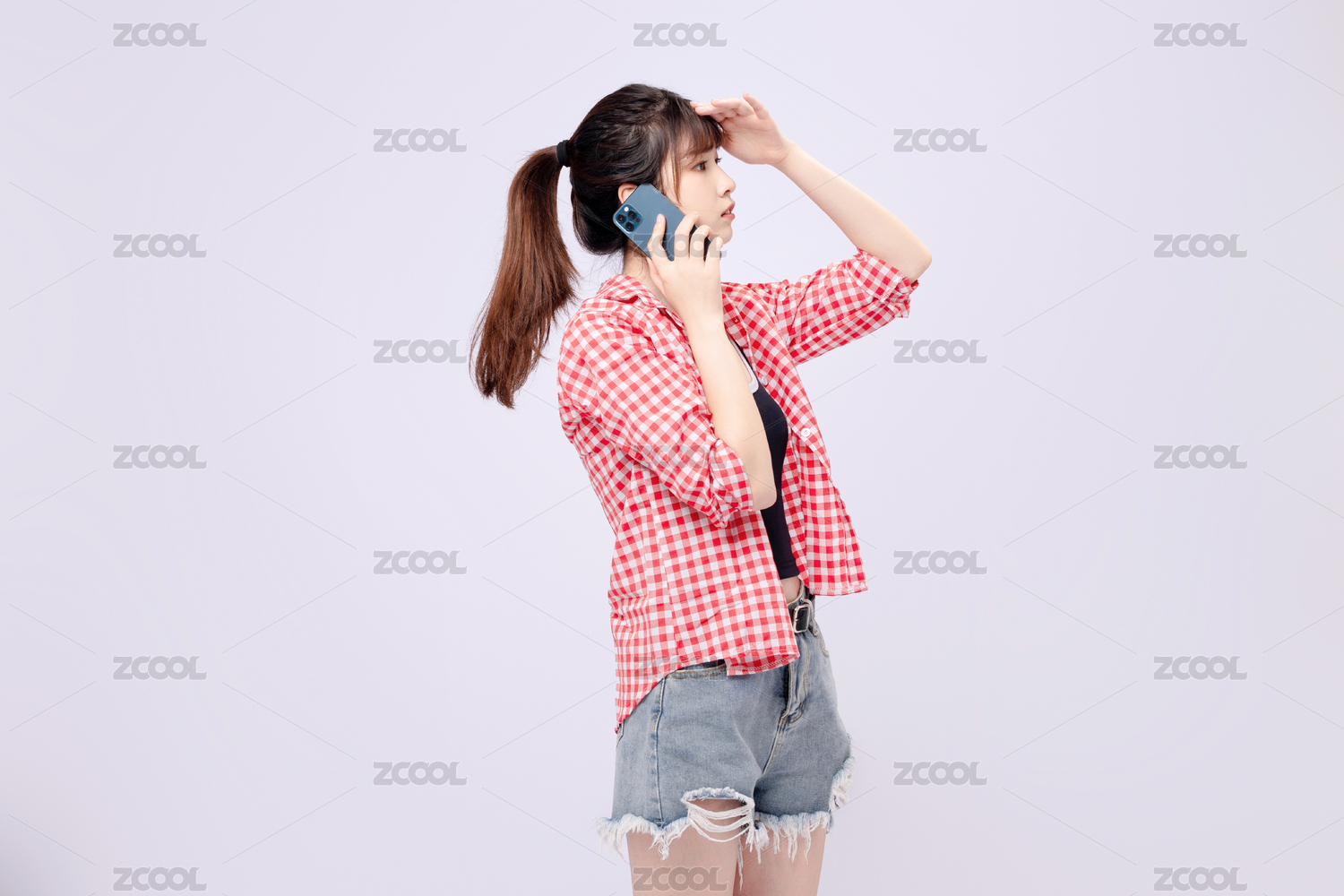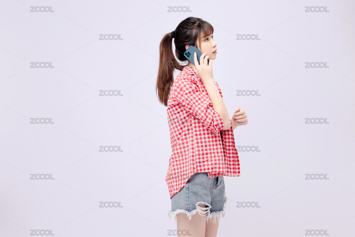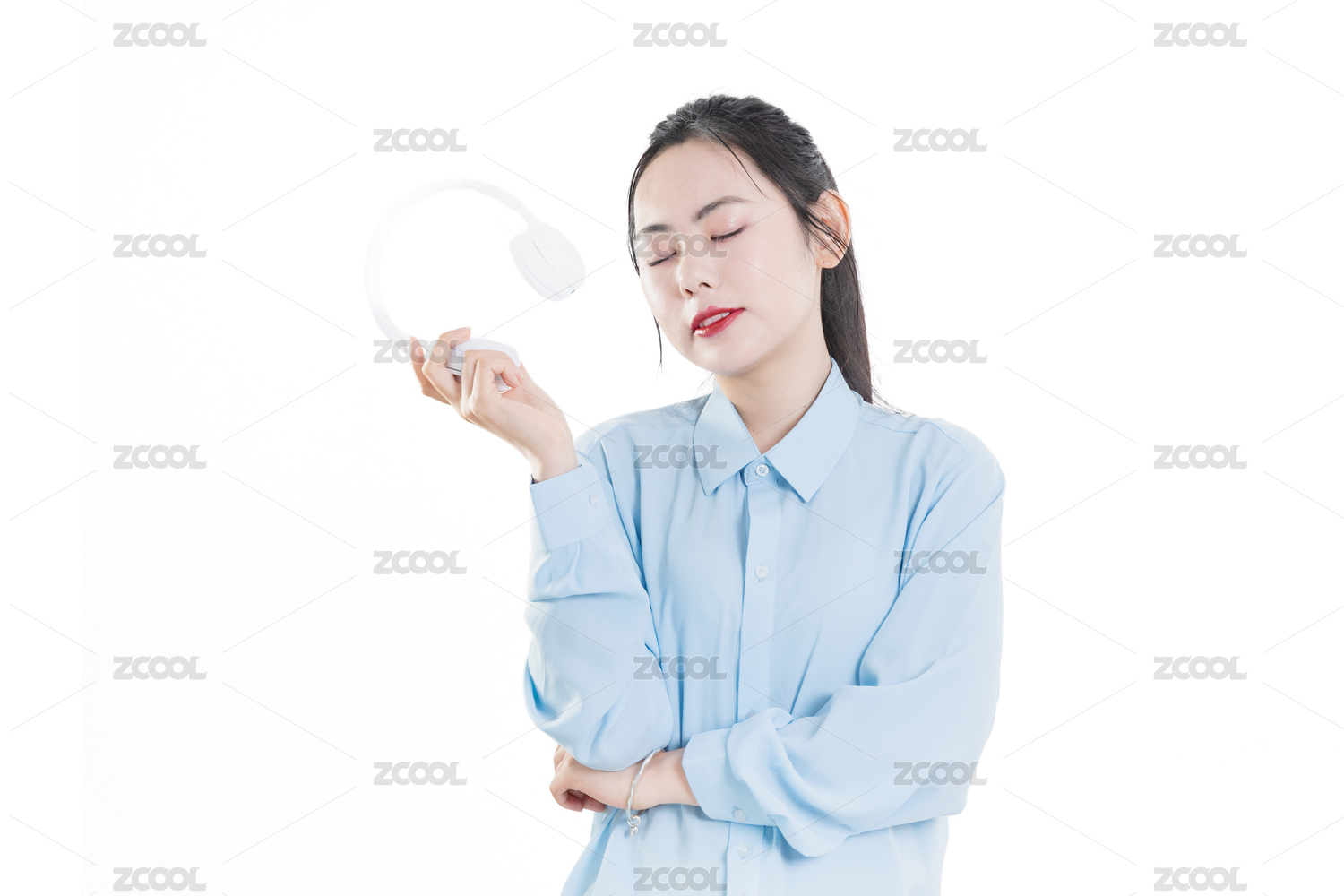 穿着蓝色衬衣手拿耳机的中国女孩