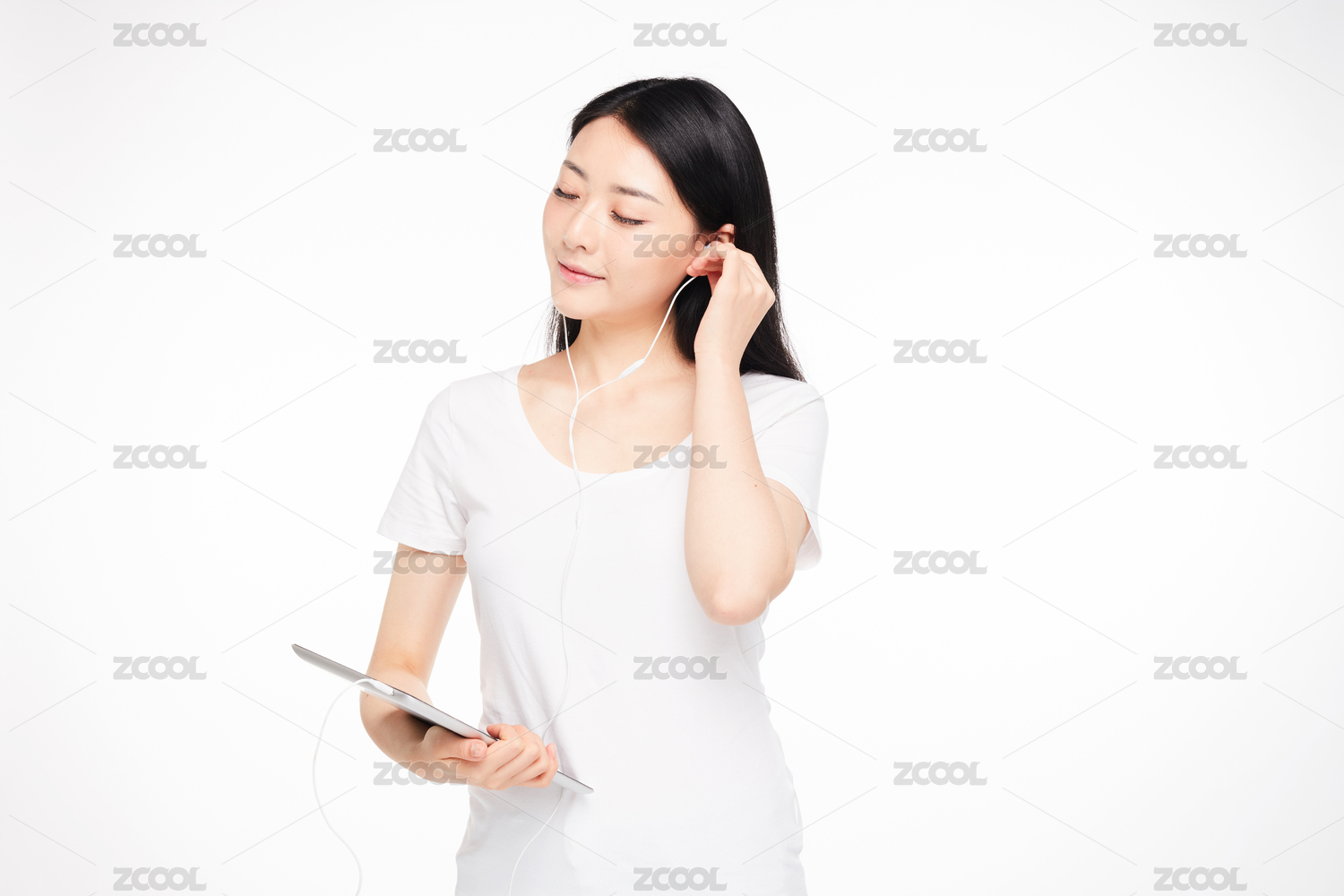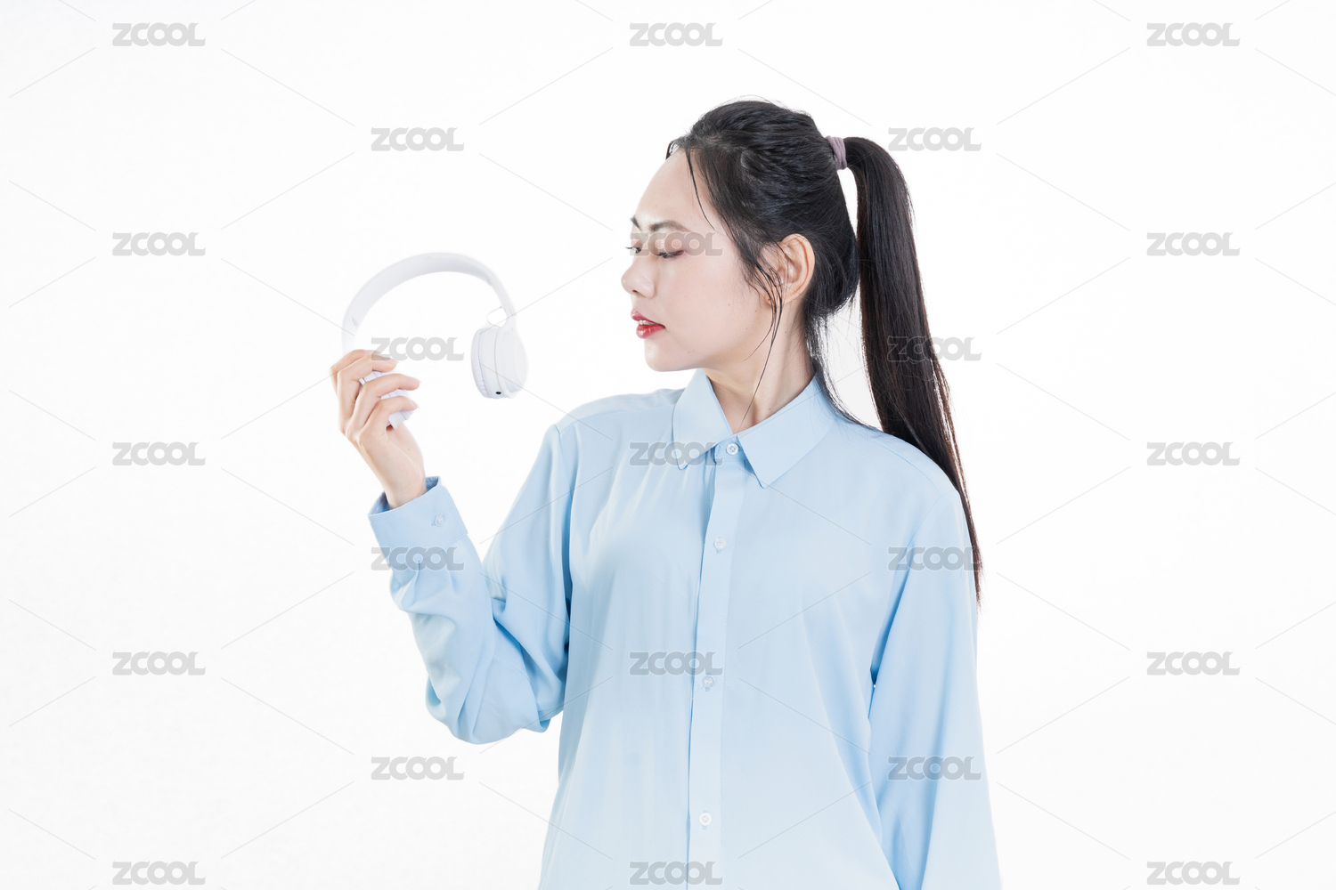 穿着蓝色衬衣戴着白色耳机的中国女孩