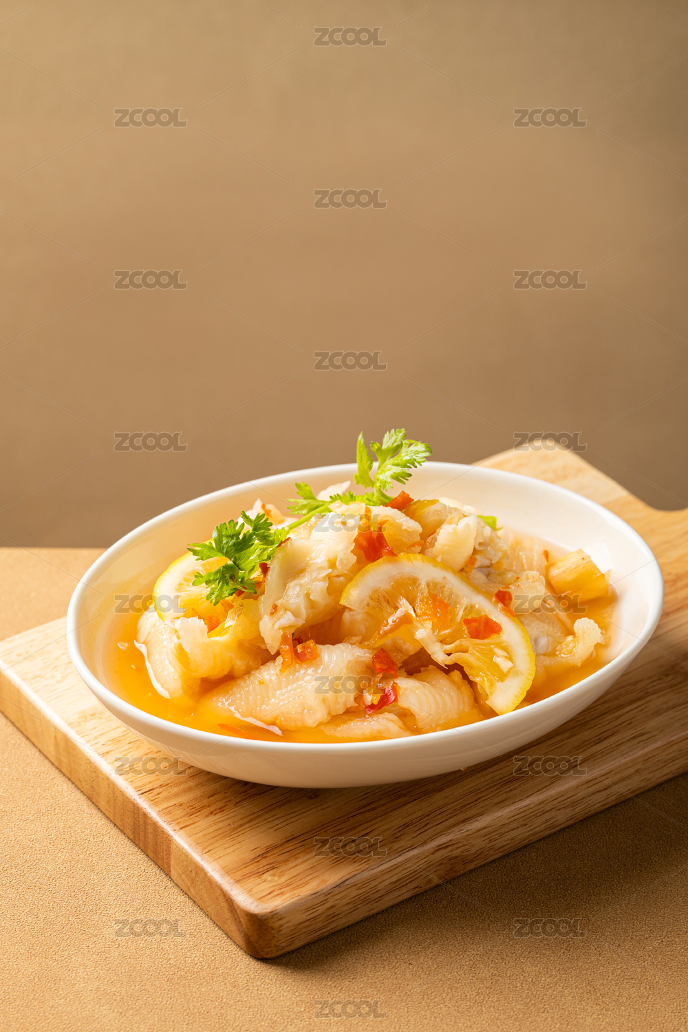 木桌上的一碗拌好的四川凉菜红油耳丝特写