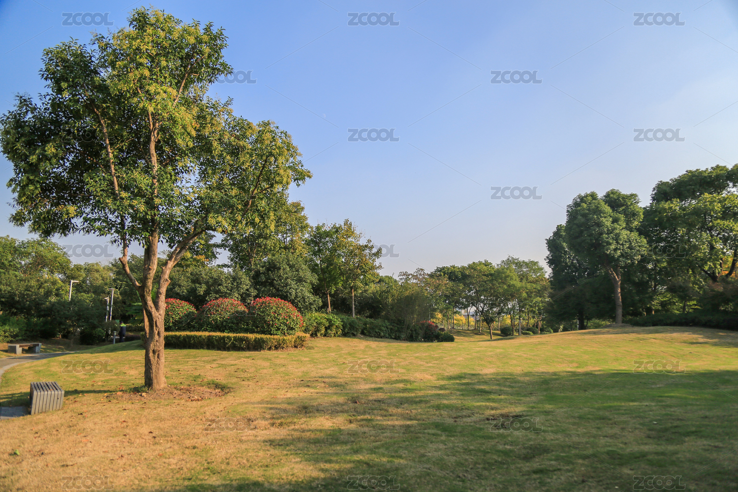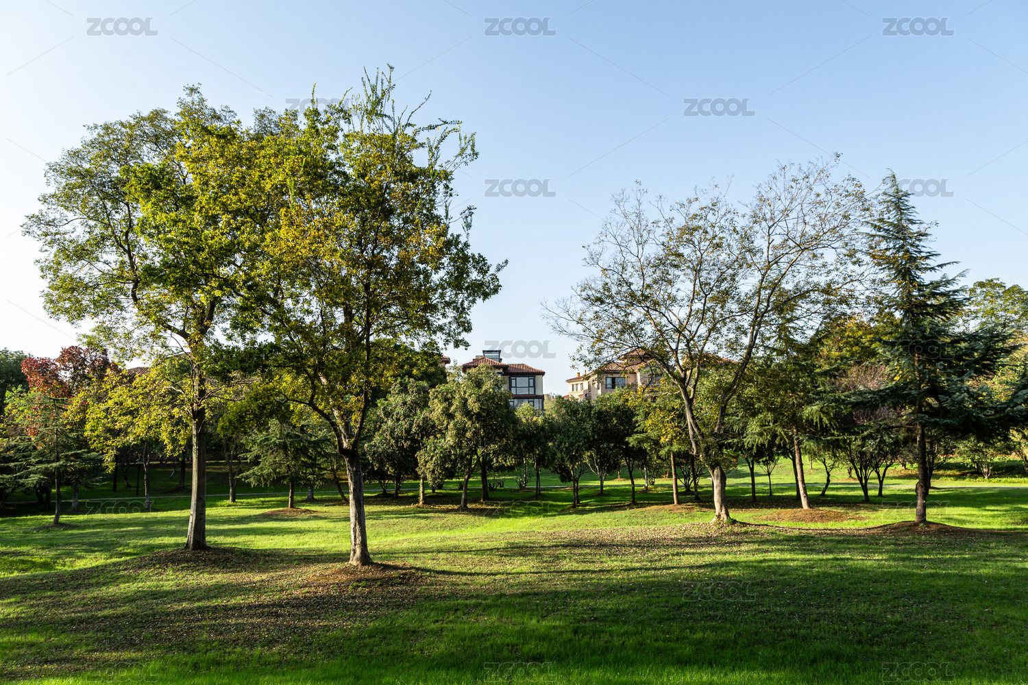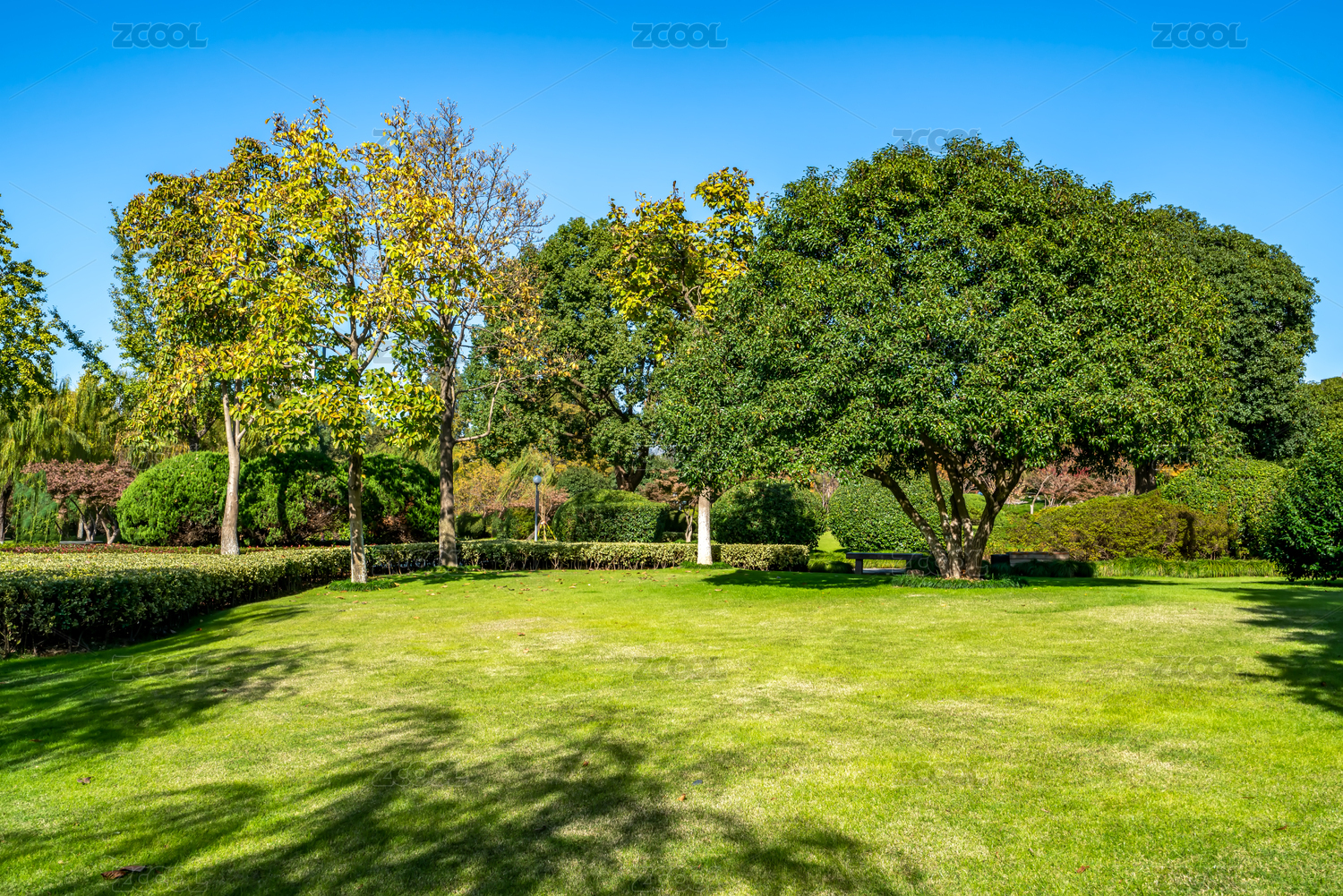 中国哈尔滨秋季晴天太阳岛景区花园草地树林道路