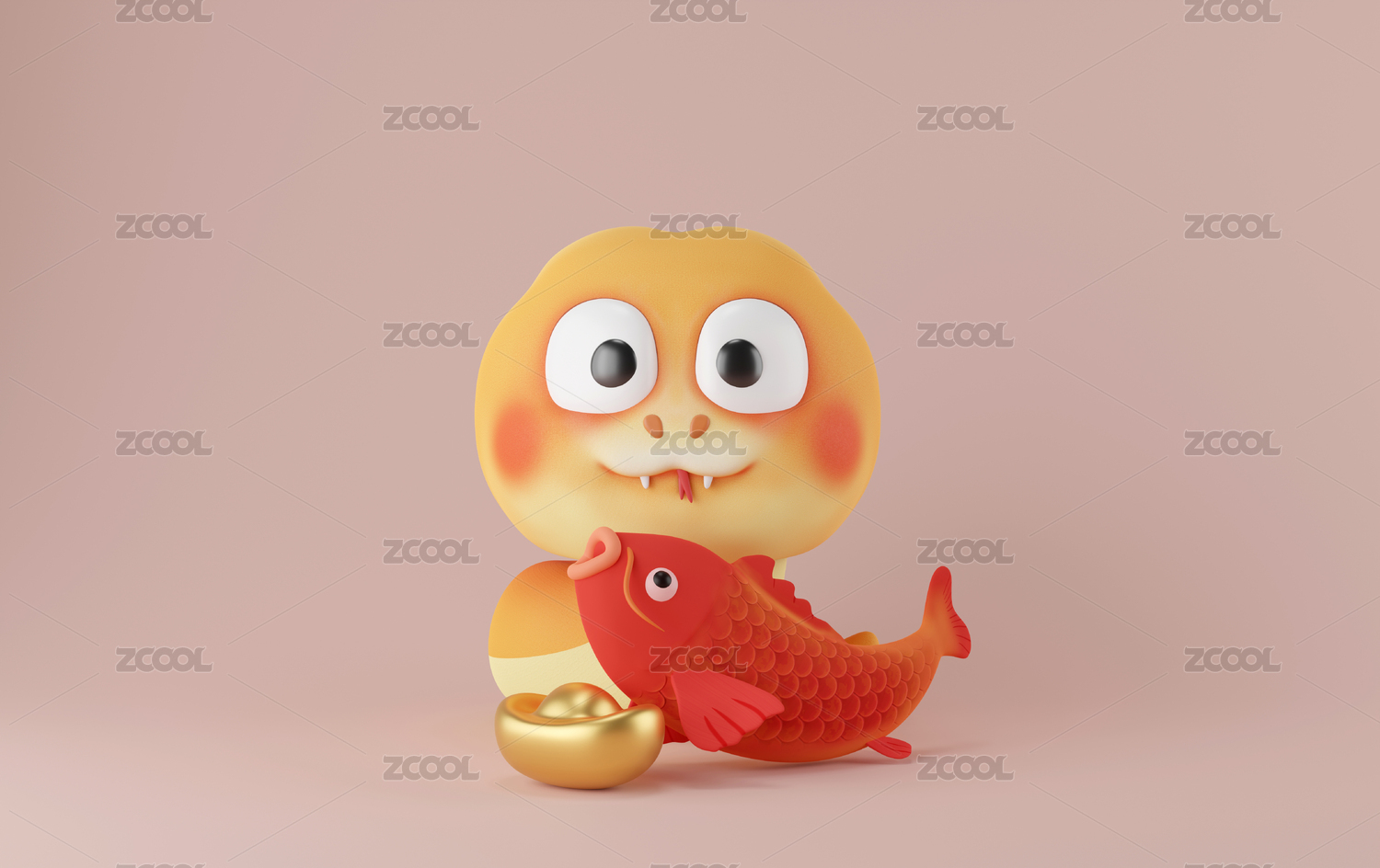 可爱的中国蛇年卡通生肖形象与红色鲤鱼