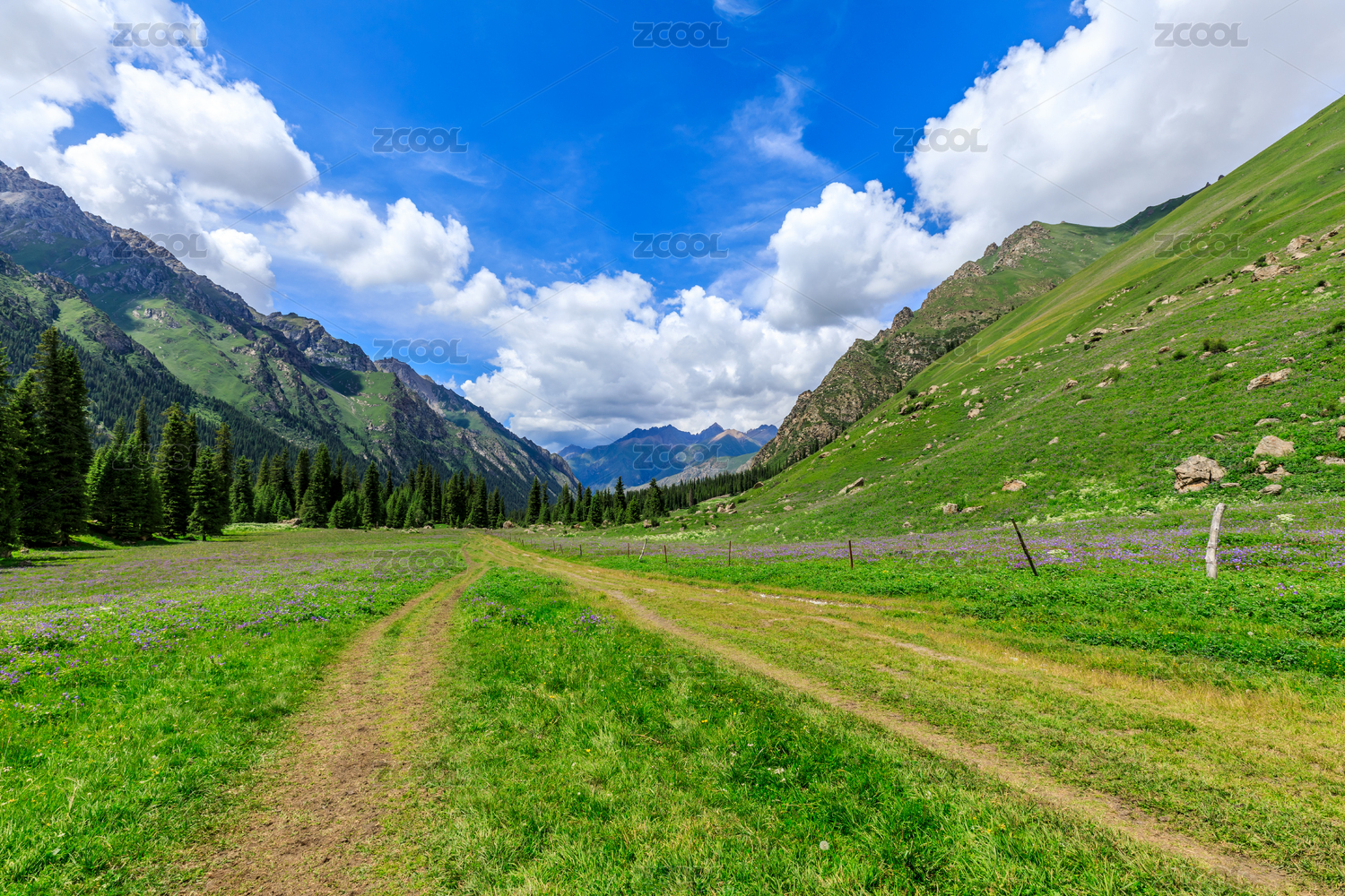 中国新疆伊犁蓝天白云下的雪山草原森林小溪