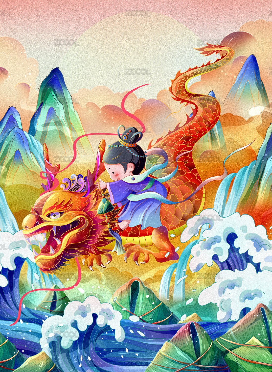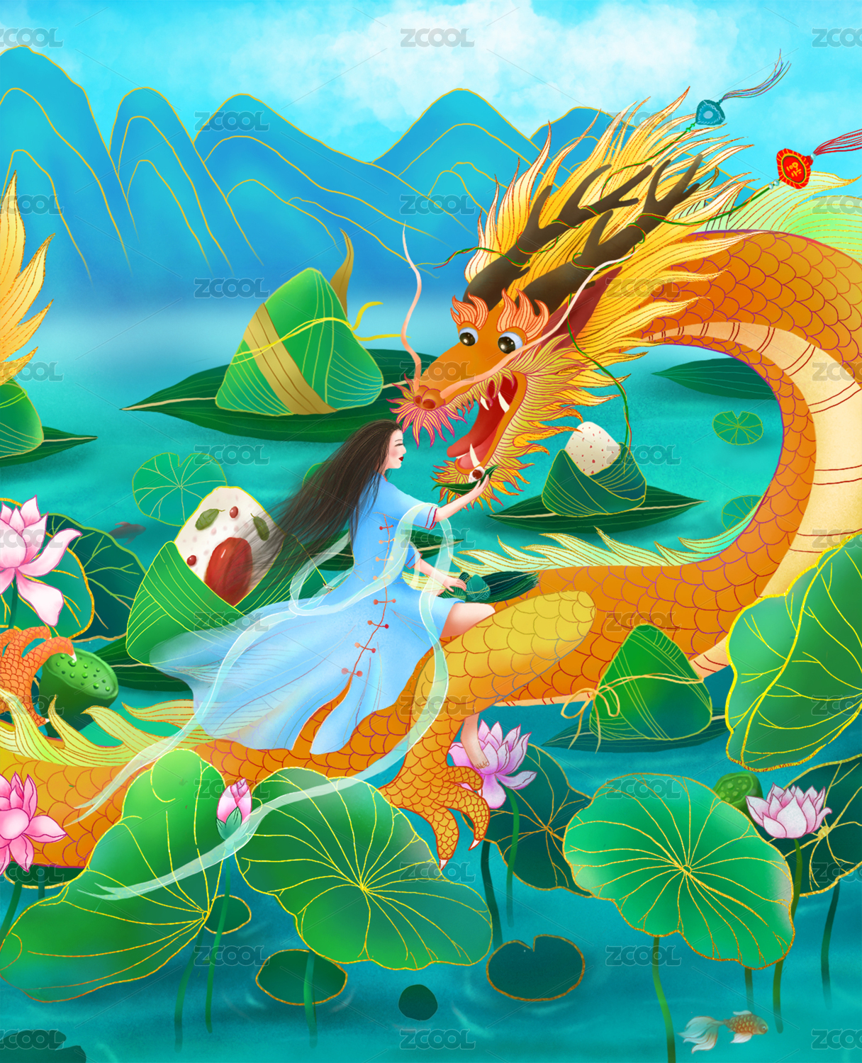 HECDBF2020,端午,粽子,龙,海浪,国潮,明快,女子,荷花,山