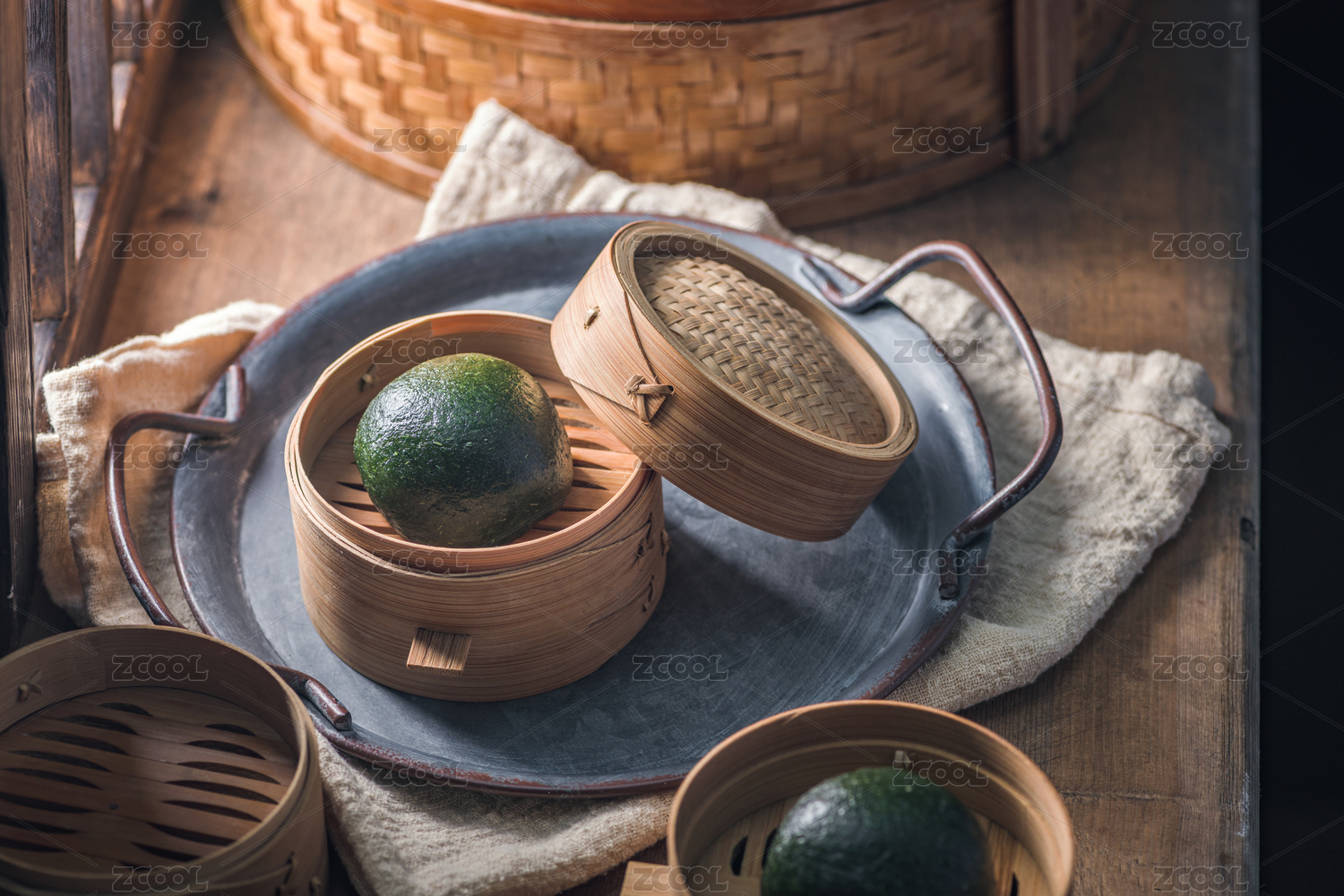 餐桌上放着一个蒸笼,笼里有三个热乎的青团
