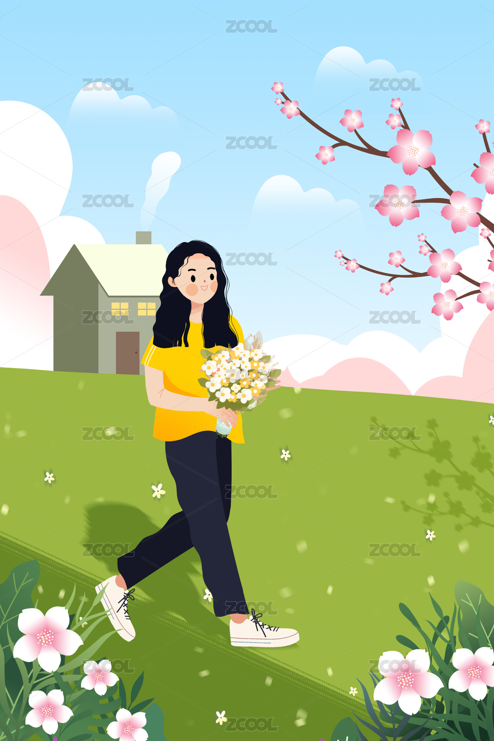 春天樱花与女孩矢量插画