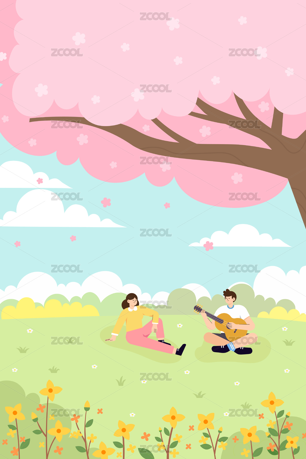 春天一对情侣在樱花树下约会矢量插画