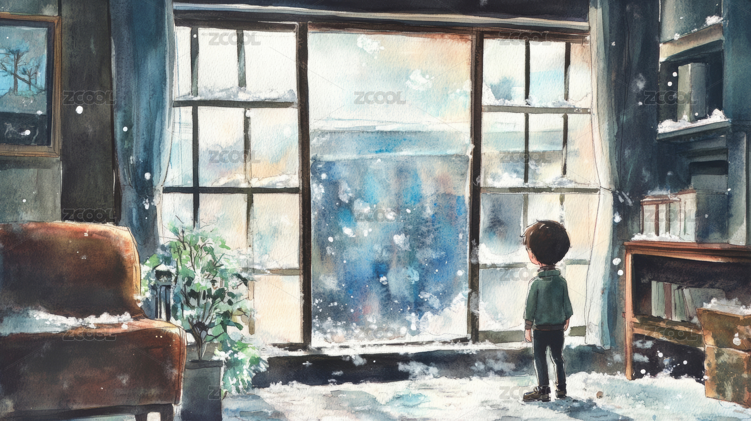 孩子站在窗户前,看窗外冬天雪景,留守儿童