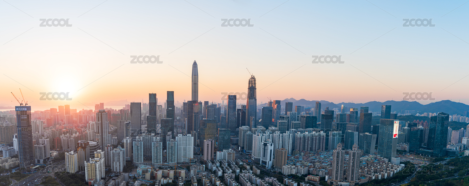 夕阳下的中国广东省深圳平安大厦天际线建筑群风光