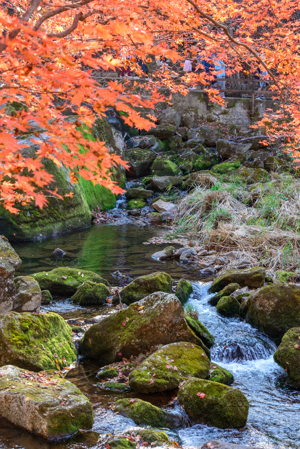 沈阳本溪老边沟,秋季枫树红叶溪流自然风光