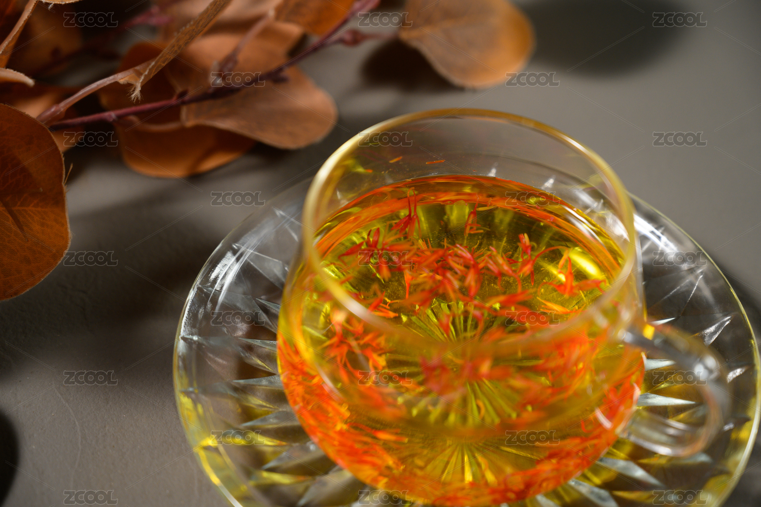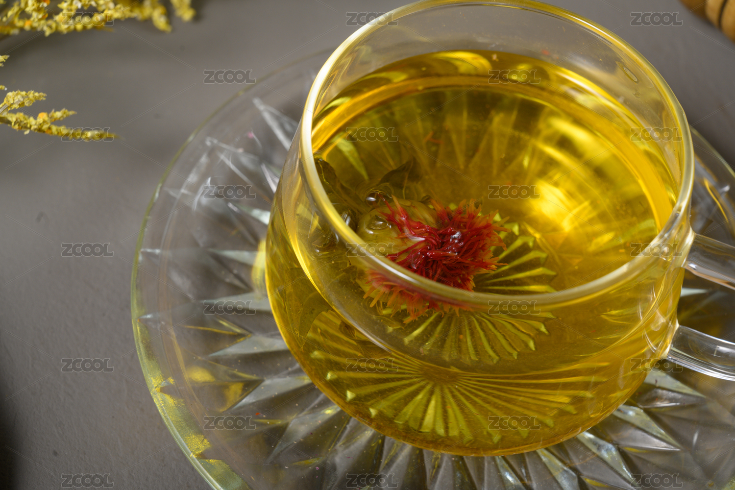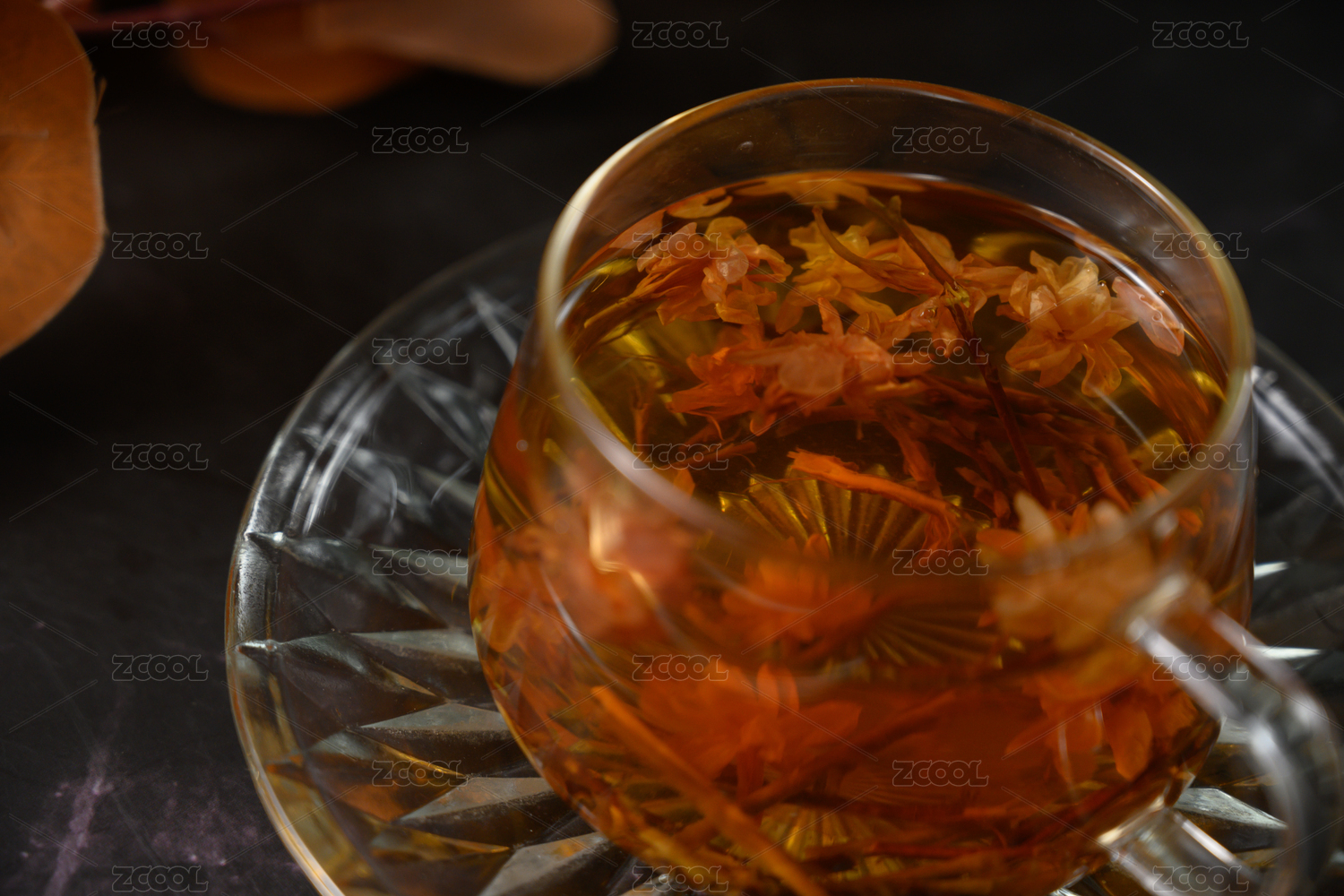 桌面上的杯子里的甘甜可口的金盏菊花茶