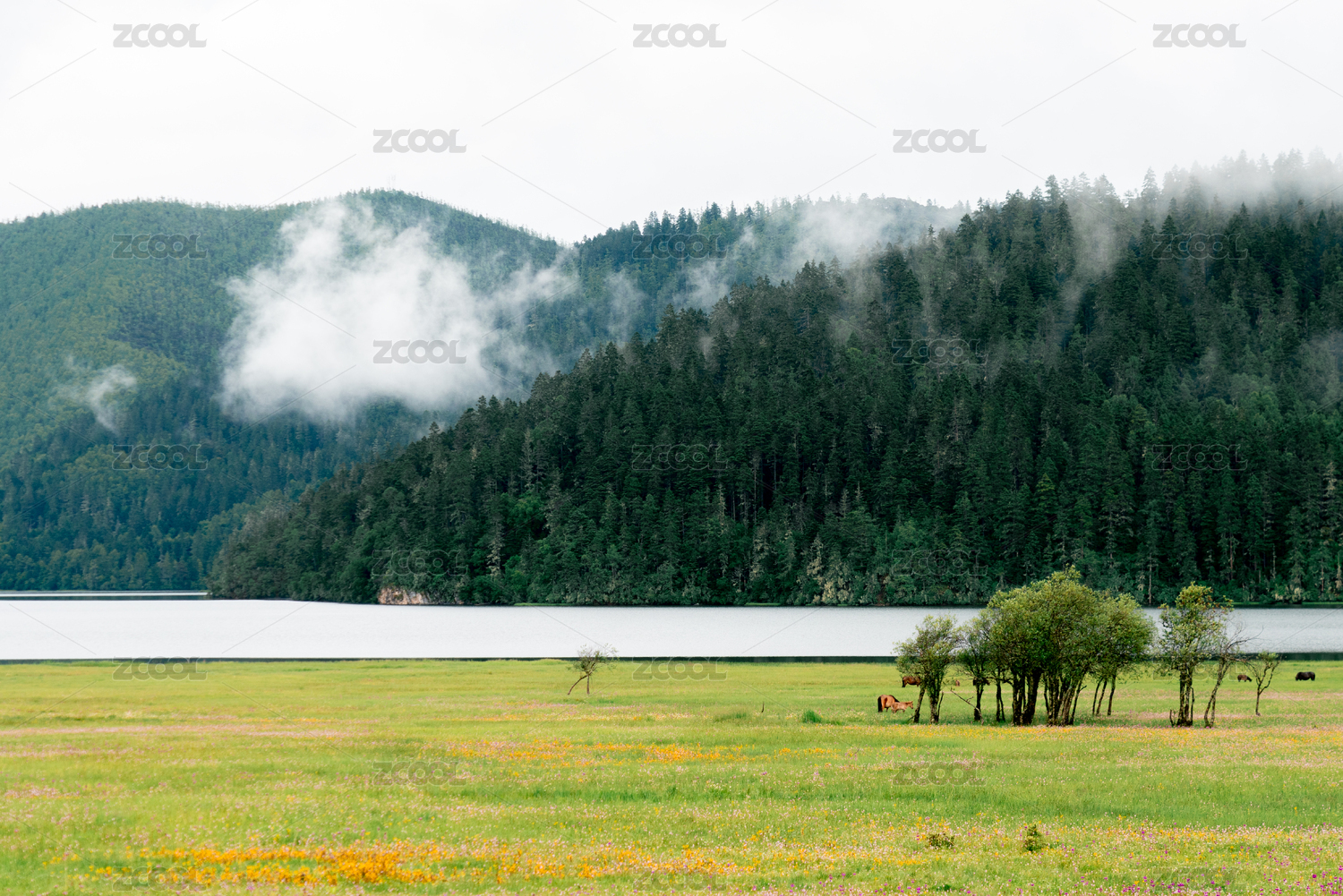 云南中甸香格里拉的碧塔海的草甸,湿地和树