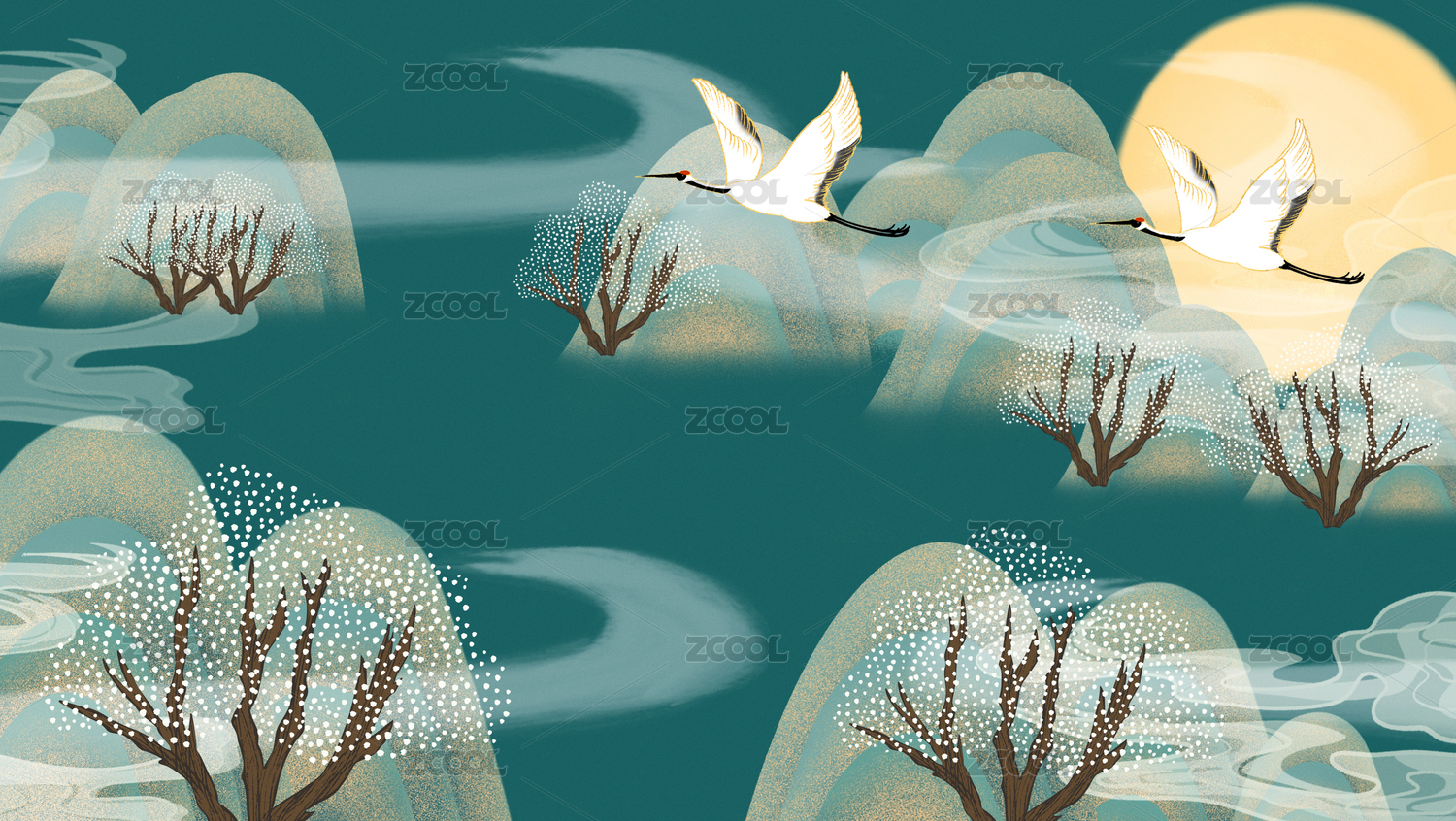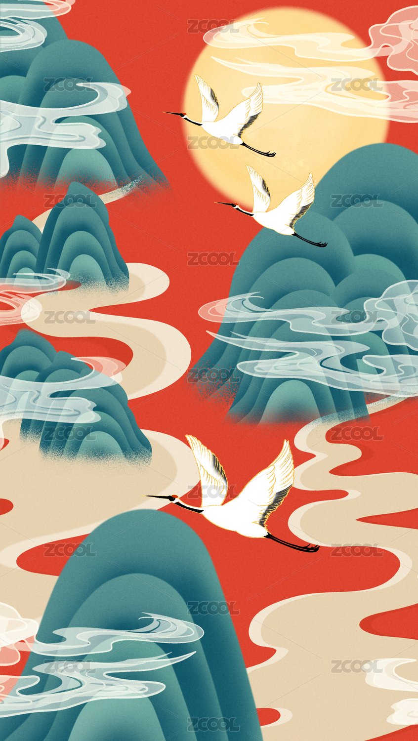 插画,山水画,国潮,国风,中国风,山水,仙鹤,丹顶鹤,宝塔,中秋节